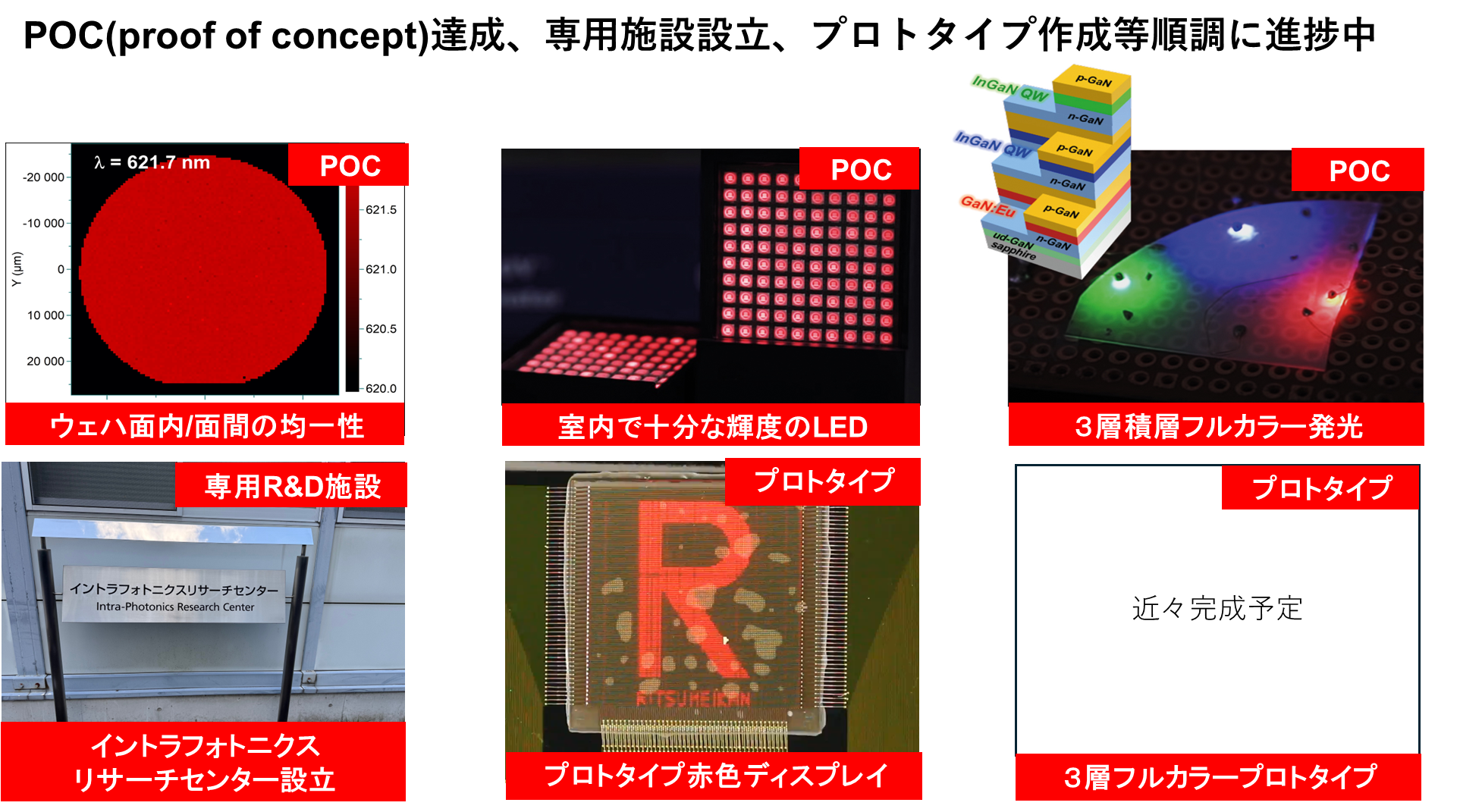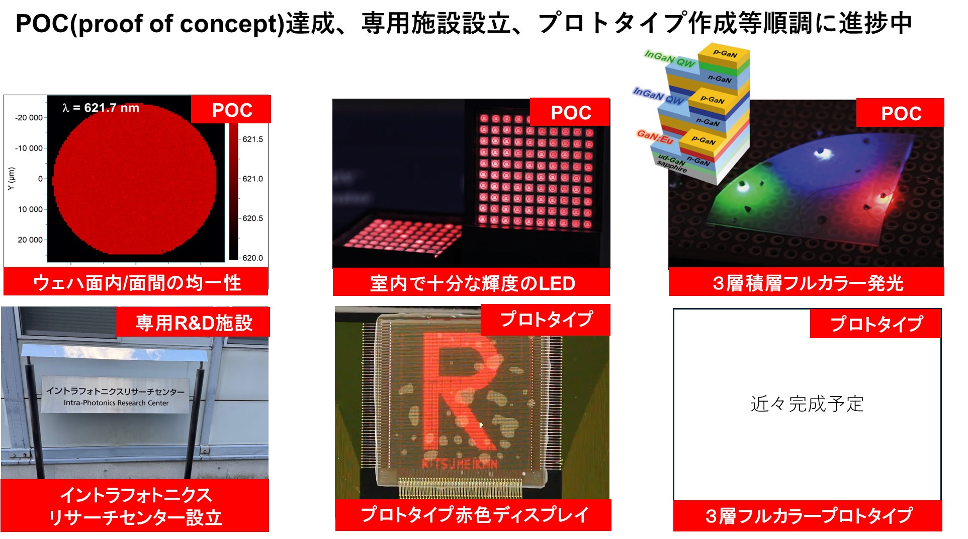 IntraPhotonは、世界で唯一実用化に成功している希土類Eu添加GaN技術を用い、微細化しても効率が低下しない赤色LEDを実現。さらに青・緑LEDとの同一基板上三層積層技術により、超高精細・高輝度・高均一性を兼ね備えた次世代マイクロLEDの開発を進めています。