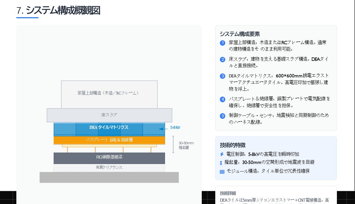 本仕様書では、誘電エラストマー・アクチュエータ(DEA)をタイル状に敷設し、高電圧印加による変形を利用して、基礎と地盤の間の相対運動を低減する仕組みを提示しています。