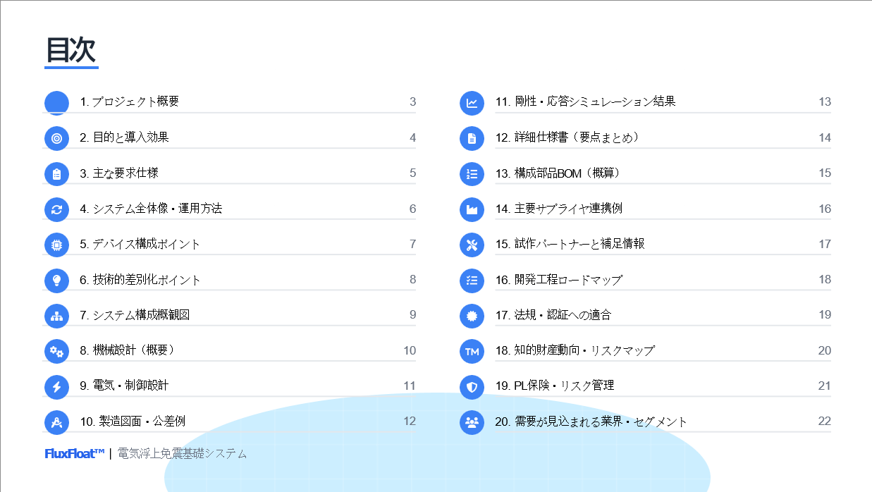 本仕様書は、単なる思いつきメモではなく、完成予想イメージ、要求仕様、制御フロー、構造・材料・電気設計、BOM、試作先候補、法規制整理、知財~特許取得戦略、需要見込みまでを含んだ、事業化を見据えたPowerPoint約50ページの仕様書パッケージです。