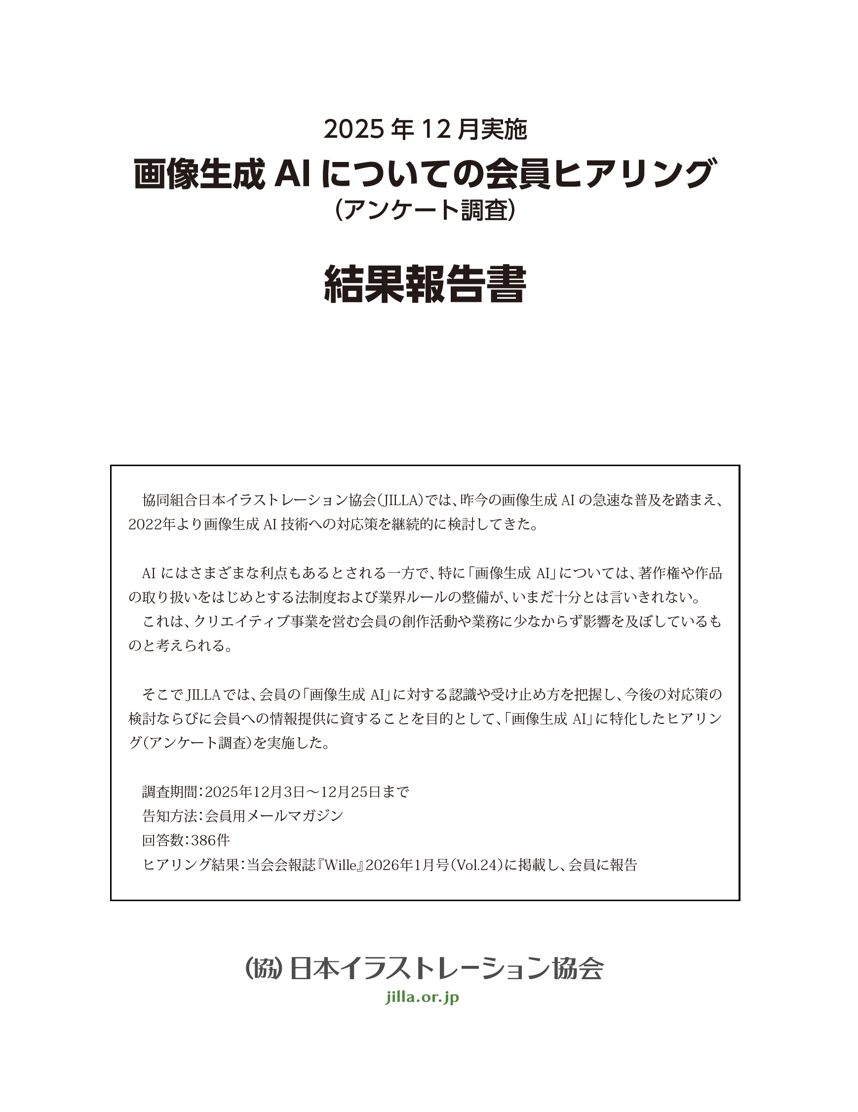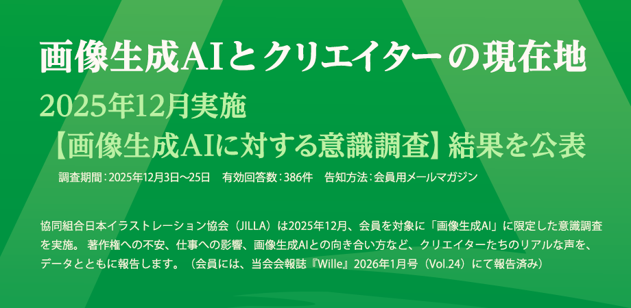 協同組合日本イラストレーション協会(以下、JILLA)は、2025年12月3日から12月25日までの期間、会員を対象に「画像生成AI」に限定した意識調査を実施しました。386件の有効回答を集計・分析した結果を、JILLA公式ブログにて一般公開いたします。