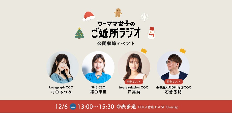 株式会社MILY(本社:東京都港区、代表取締役:村田 あつみ)は、2025年12月6日(土)、ポーラ青山ビルディング 5階 POLA ORBIS CAPITAL『Overlap』 にて、「ワーママ女子のご近所ラジオ公開収録 Vol.2 @クリスマス会」を開催しました。