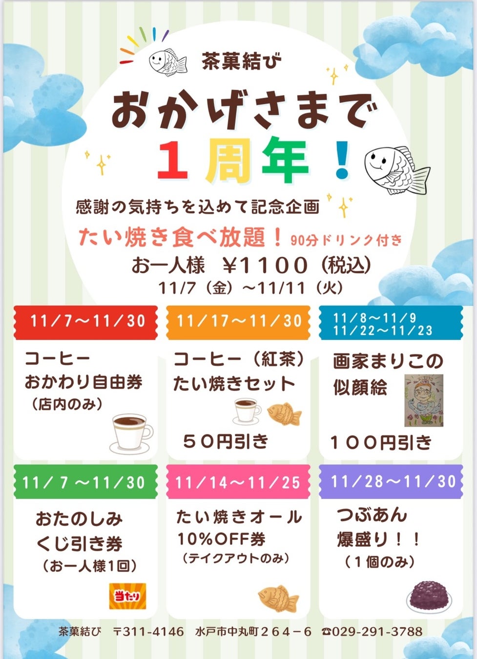 茨城県水戸市で、たい焼き販売と無料出展&観覧ギャラリーを組み合わせたユニークな店舗として支持を集める「茶菓 結び」(オーナー:熊井弘子、以下「茶菓結び」)は、開業1周年を記念して2025年11月7日(金)〜11月30日(日)までを「1周年ありがとう月間」として、地域参加型の記念イベントを実施します。