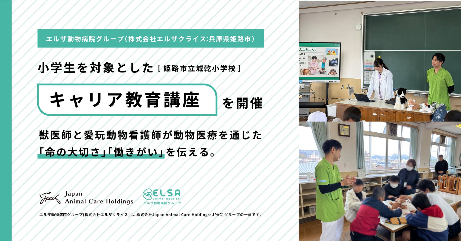 県内でトップシェアを有する最大級の動物病院グループであるエルザ動物病院グループ(JPACグループ)は、2025年12月3日、姫路市立城乾小学校にてキャリア教育の一環として「獣医療の仕事」をテーマにした獣医師と愛玩動物看護師の仕事を学ぶ特別授業を実施しました。授業では、獣医師や愛玩動物看護師の役割や動物の命を守る大切な仕事と働きがいを紹介し、子どもたちが楽しみながら学べる「キッズ獣医師クイズ大会」も行われました。