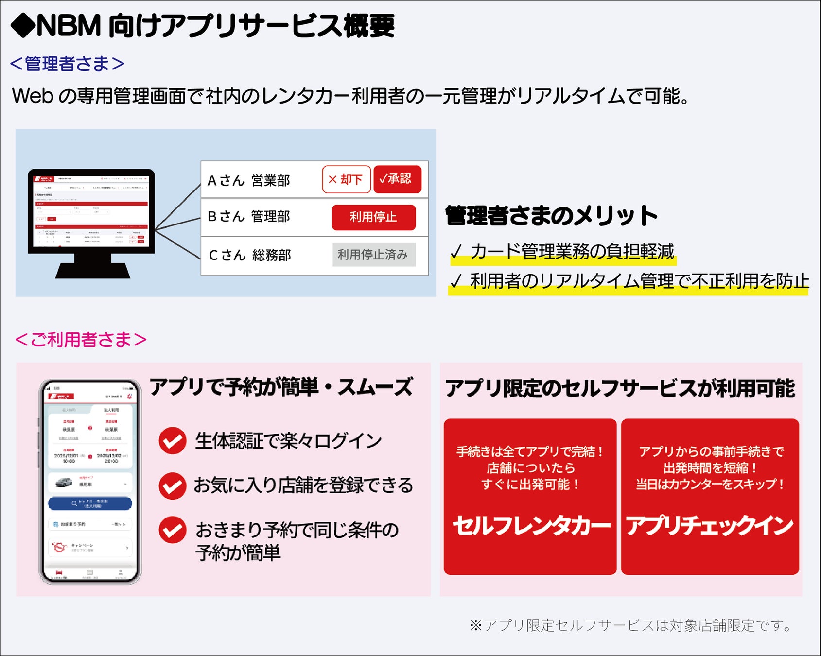 NBMの管理者・利用者どちらもより便利にご利用いただけるサービスとなっております。この機会にニッポンレンタカー法人会員のご契約をご検討いただき、アプリの利便性をぜひご体感ください。