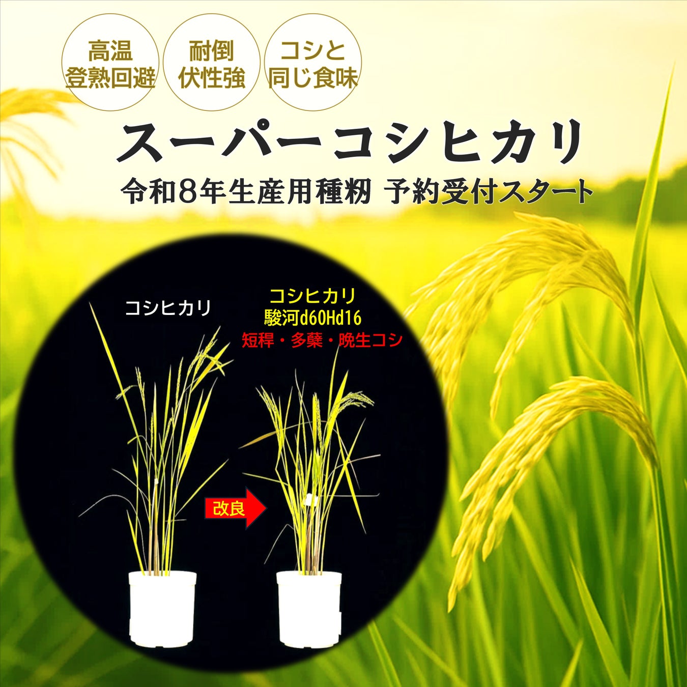 株式会社ニューディメンジョンDNA研究所は、スーパーコシヒカリ、すなわち新品種『コシヒカリ駿河d60Hd16』の種籾予約販売を開始しました!