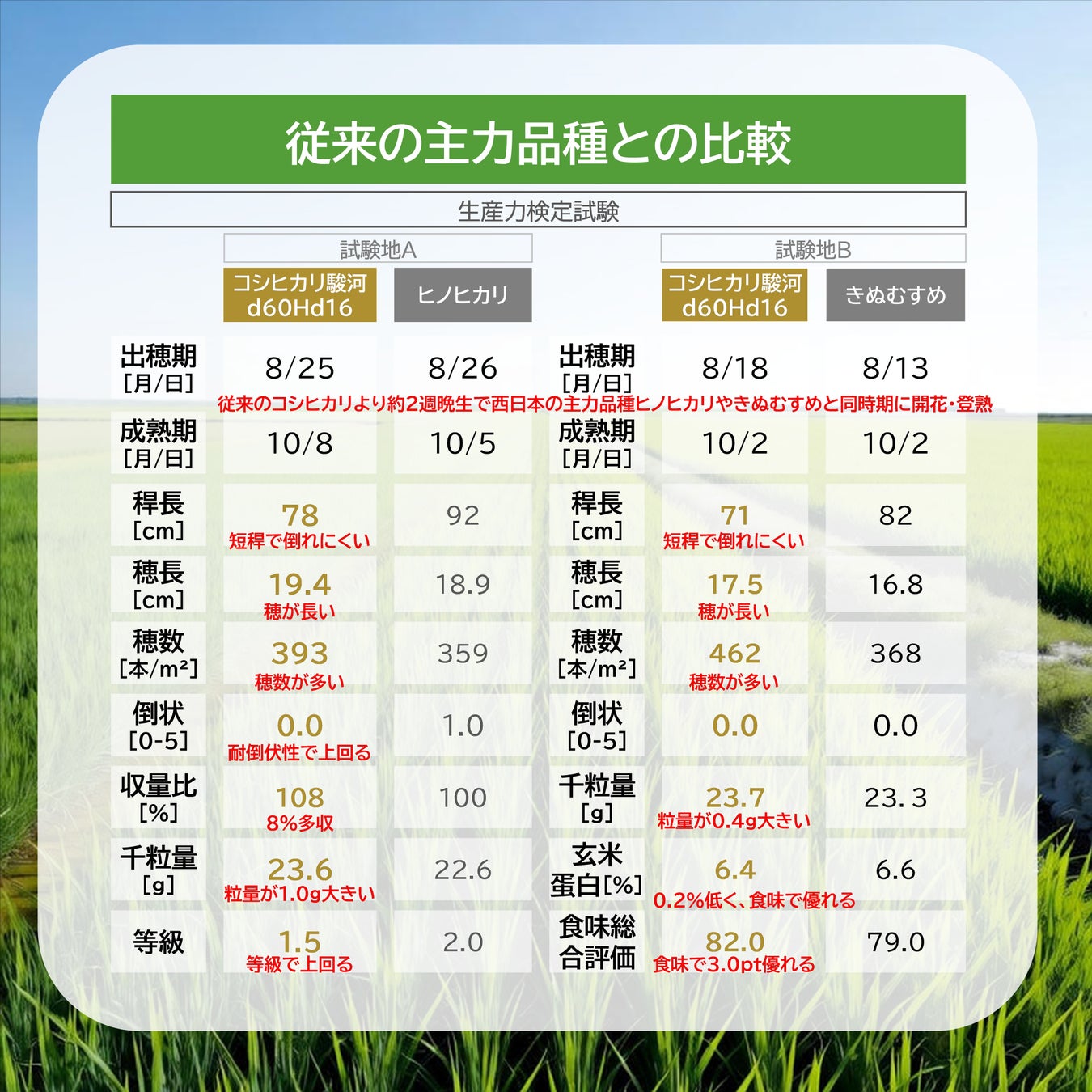 「コシヒカリ駿河d60Hd16」は、コシヒカリよりも約14日間晩生で高温登熟を回避できるとともに、約13㎝短稈で台風に対する倒伏耐性を強靭化した上、コシヒカリの良食味をそのまま受け継いだスーパーコシヒカリです。