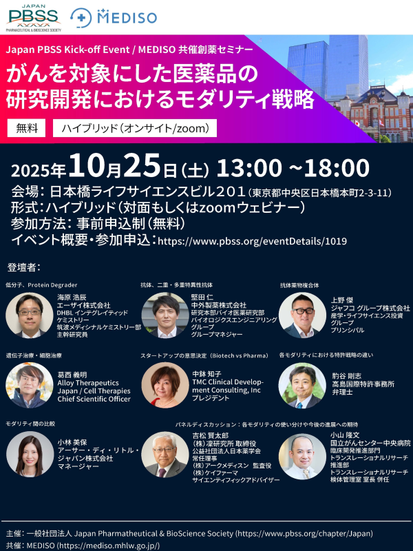 当団体の設立を記念し、2025年10月25日(土)に東京・日本橋にて、厚生労働省委託「医療系ベンチャー・トータルサポート事業」(MEDISO)と共催でキックオフイベントを開催します。テーマは「がんを対象にした医薬品の研究開発におけるモダリティ*戦略」になります。国内外の第一線で活躍する実務担当者が登壇し、研究から非臨床、臨床、事業化までの最前線を多角的に議論します。