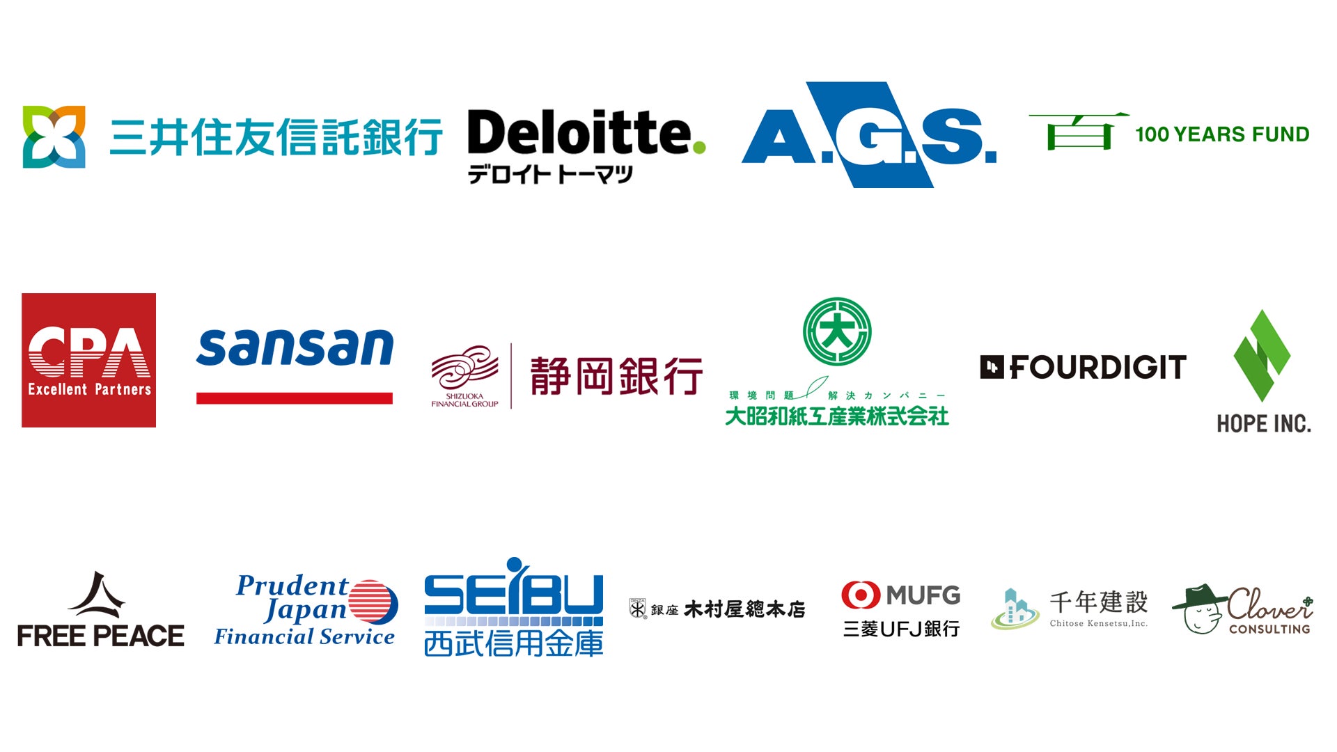 三井住友信託銀行株式会社さま / デロイト トーマツ ベンチャーサポート株式会社さま / 株式会社AGSコンサルティングさま / 100年ファンドさま / CPAエクセレントパートナーズ株式会社さま / Sansan株式会社さま / 株式会社静岡銀行さま / 大昭和紙工産業株式会社さま / 株式会社フォーデジットさま / 株式会社ホープさま / 株式会社FREE PEACEさま / プルーデント・ジャパン・ファイナンシャル・サービス株式会社さま / 西武信用金庫さま / 株式会社 木村屋總本店さま / 株式会社三菱UFJ銀行さま / 千年建設株式会社さま / クローバーコンサルティング株式会社さま / 和パートナー合同会社さま