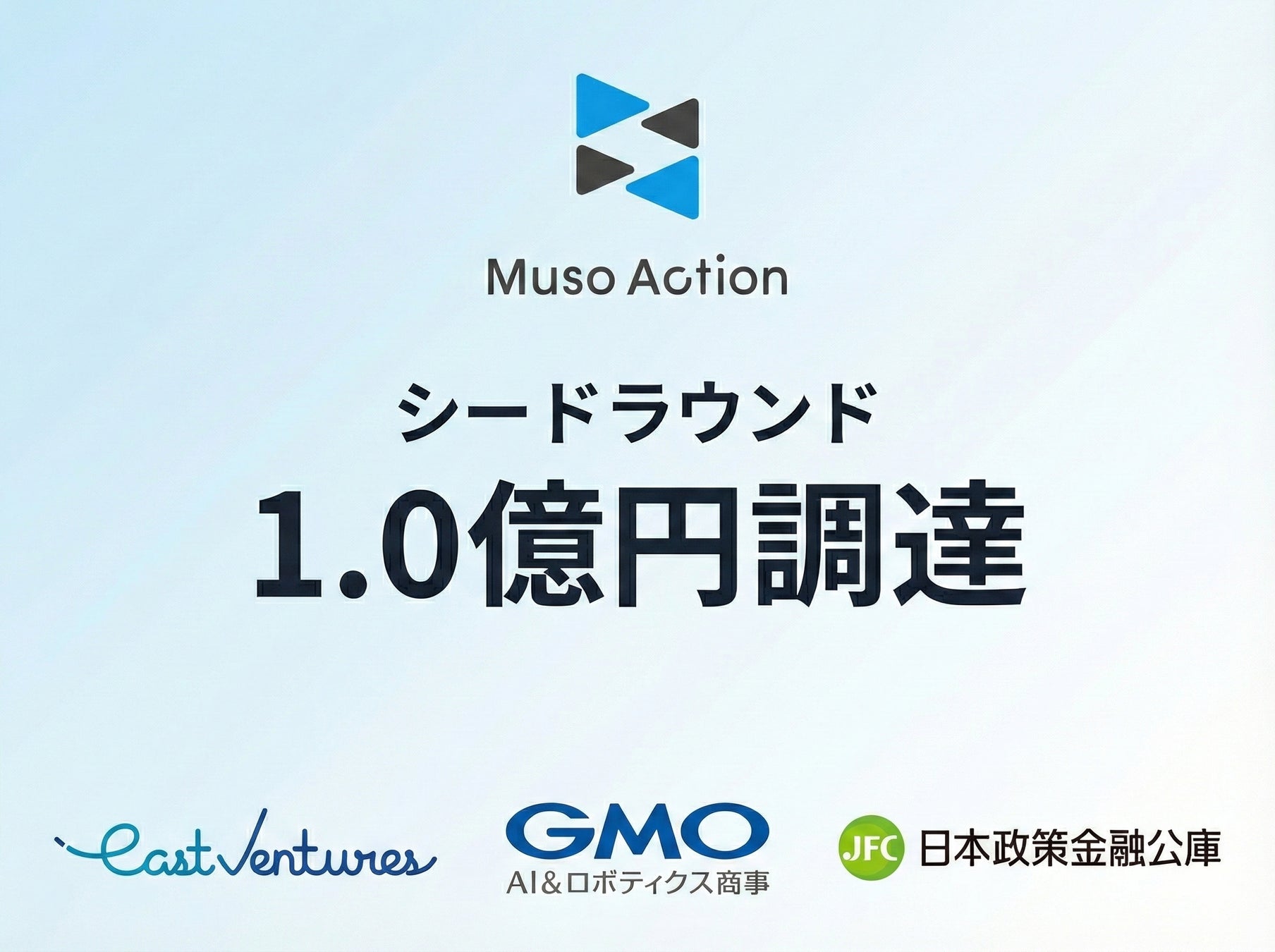 Muso Action株式会社(本社:東京都千代田区、代表取締役CEO:村山 龍太郎、以下「Muso Action」)は、シードラウンドにおいてJ-KISS型新株予約権による資金調達と日本政策金融公庫からの創業融資と合わせて総額1.0億円の資金調達を実施したことをお知らせします。本ラウンドでは、East Ventures、GMO AI&ロボティクス商事株式会社、ならびに個人投資家の田中渓氏を引受先としています。