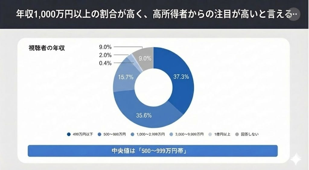 一言サマリー:年収1,000万円以上の割合が高く、高所得者からの注目が高いと言える