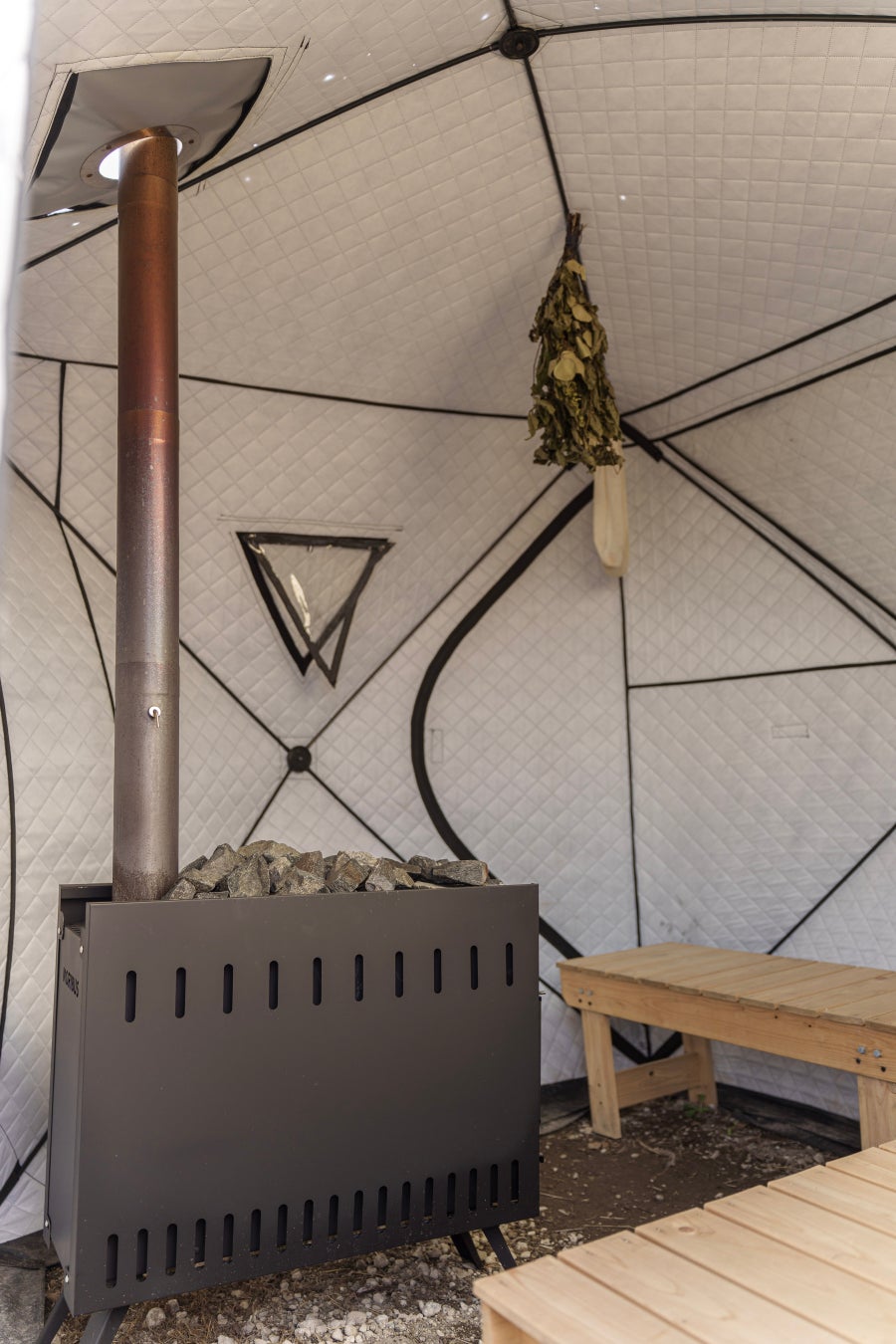 薪ストーブで熱したサウナストーンにハーブ水を注ぐと、一気に立ち上る蒸気とアロマの香り。