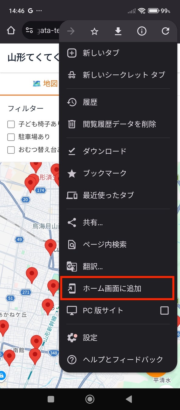 Chromeで山形てくてくマップを開き、三点リーダーをタップします。