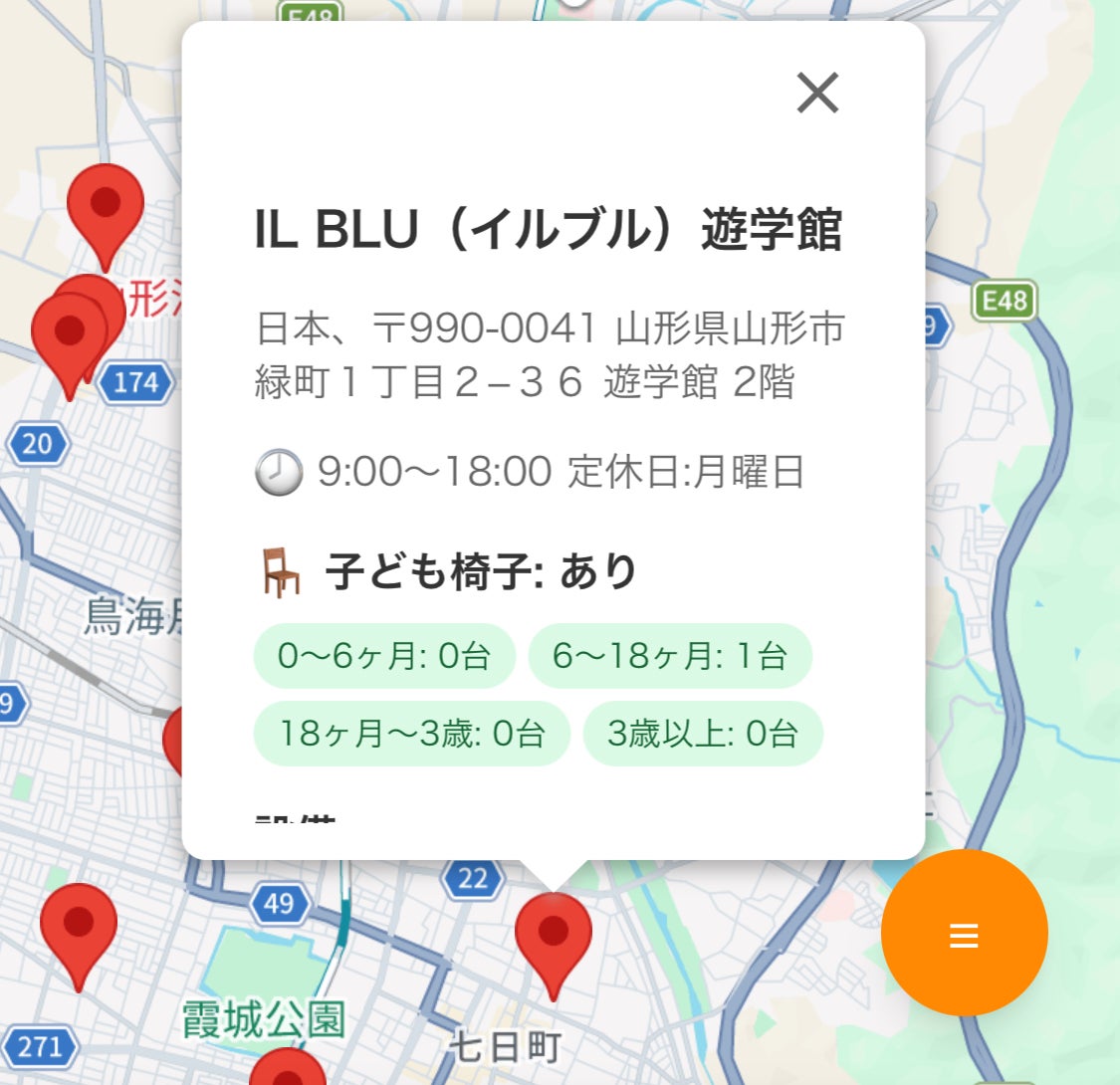 しかし、お出かけ先の情報は店舗ごとにGoogleマップやInstagramなどで個別に調べる必要があり、一括で検索できる手段がほとんどありません。全国規模の子育て支援アプリは存在するものの、山形市に特化し、座敷や子ども椅子の年齢別台数まで網羅したサービスはこれまでありませんでした。