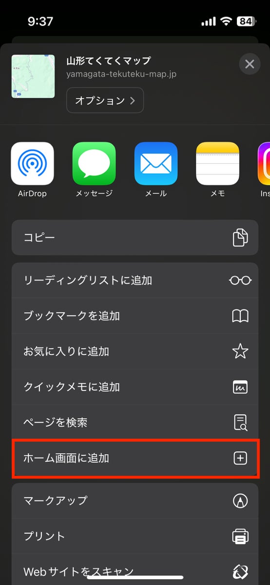 Safariで山形てくてくマップを開き、共有ボタンをタップします。
