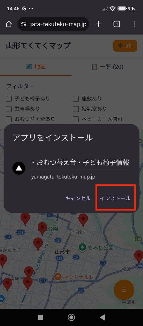 山形てくてくマップはスマホアプリではありませんが、Androidの仕様上「アプリをインストール」と表示されます。