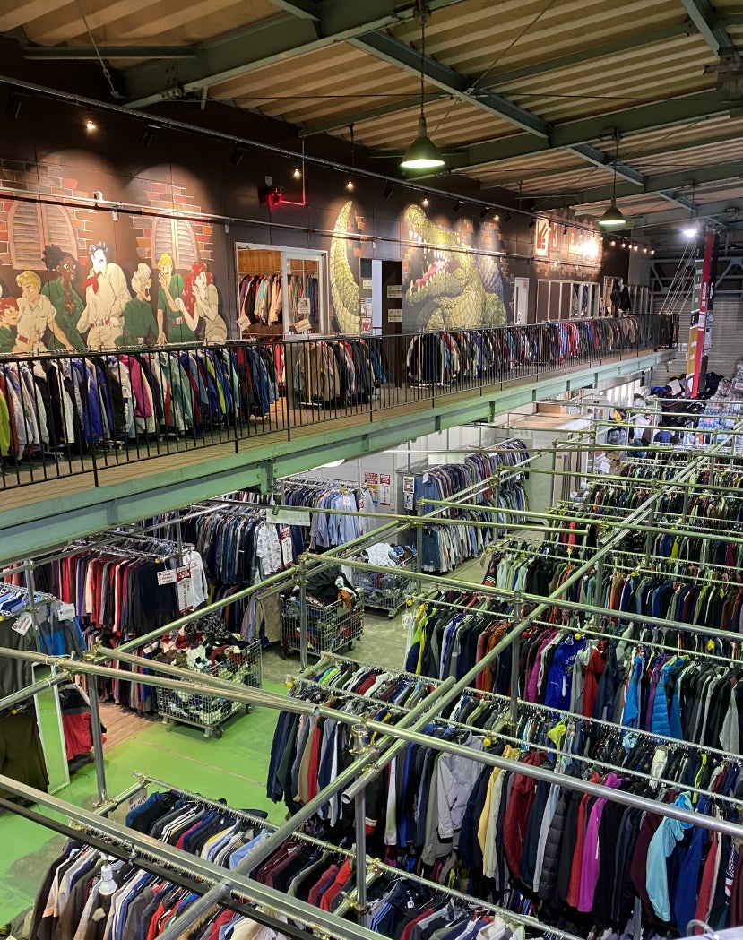 145坪で2階建の「3peace京都古着卸売倉庫」は幅広いジャンルの古着を卸売価格で約14,000着の準備しております。
