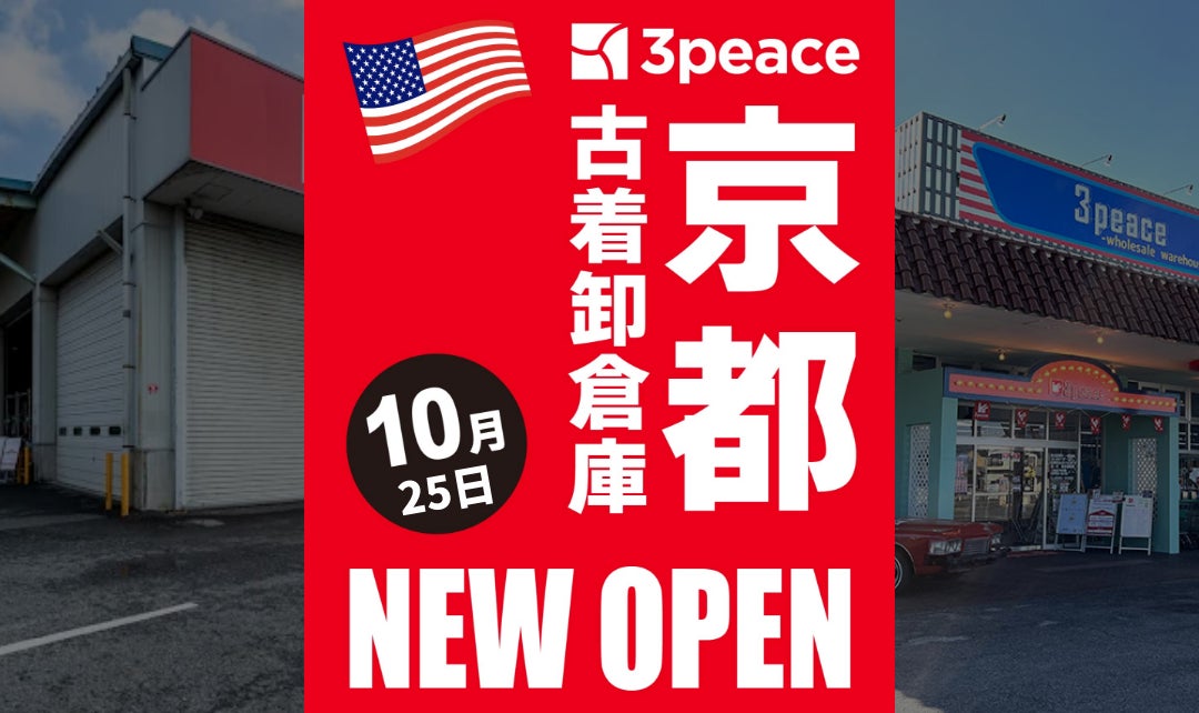 全国で古着卸売倉庫や小売店舗を展開する株式会社3peace(本社:神奈川県平塚市、代表:加藤雄大)は、倉庫としては6店舗目となる「3peace京都古着卸売倉庫」を2025年10月25日(土)、京都府宇治市にグランドオープンいたします。