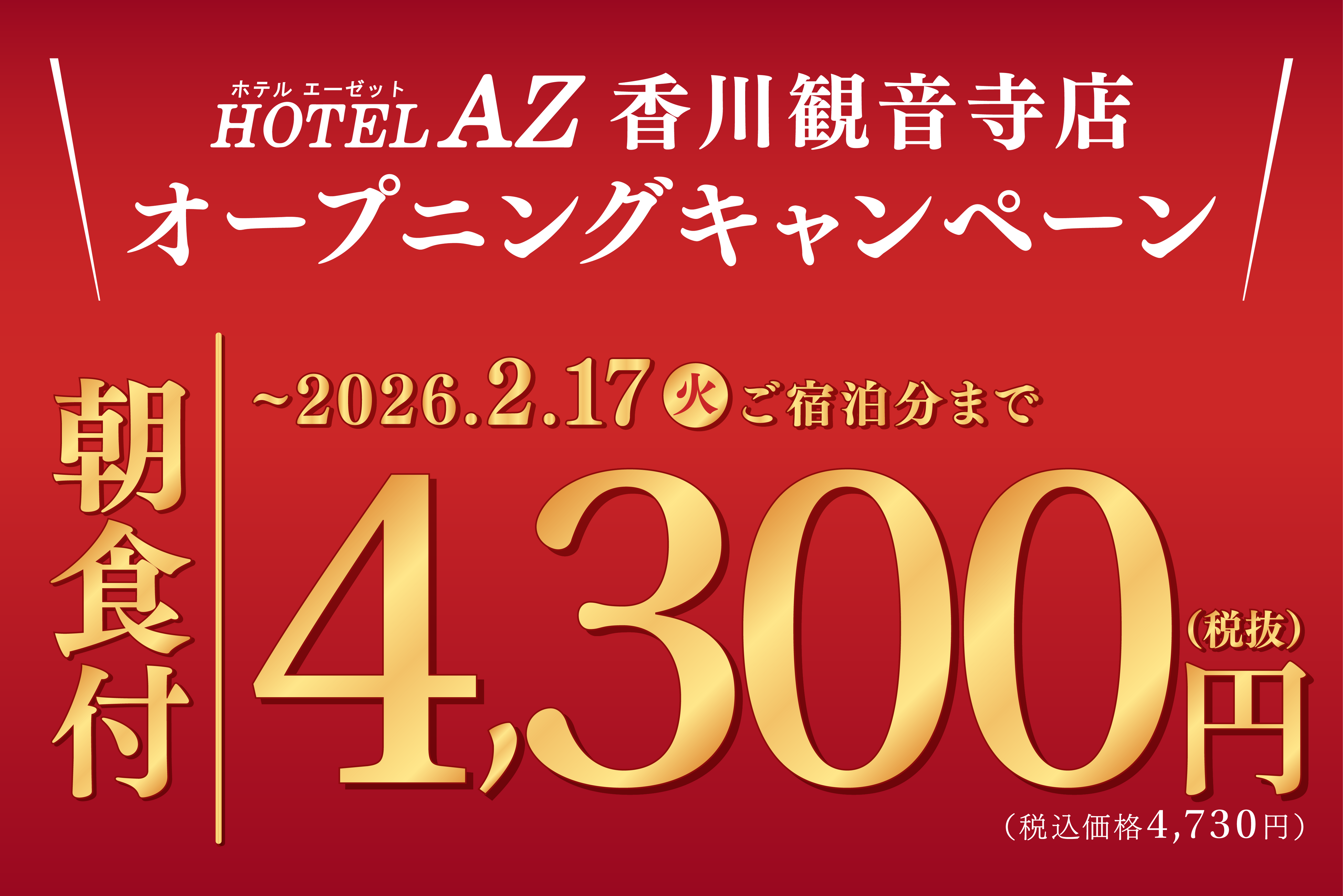 九州を中心に全国91店舗を展開する株式会社アメイズ(本社:大分県大分市)は、2026年1月18日(日)、香川県観音寺市に「HOTEL AZ 香川観音寺店」を新規開業いたします。 昨今の宿泊費高騰の中でも安心の「365日同一価格」を提供し、ビジネスや「四国八十八ヶ所巡り」の拠点として、地域に根差したサービスを展開します。開業を記念し、2月17日までの期間限定で通常料金より1,500円OFFとなるキャンペーンを実施いたします。