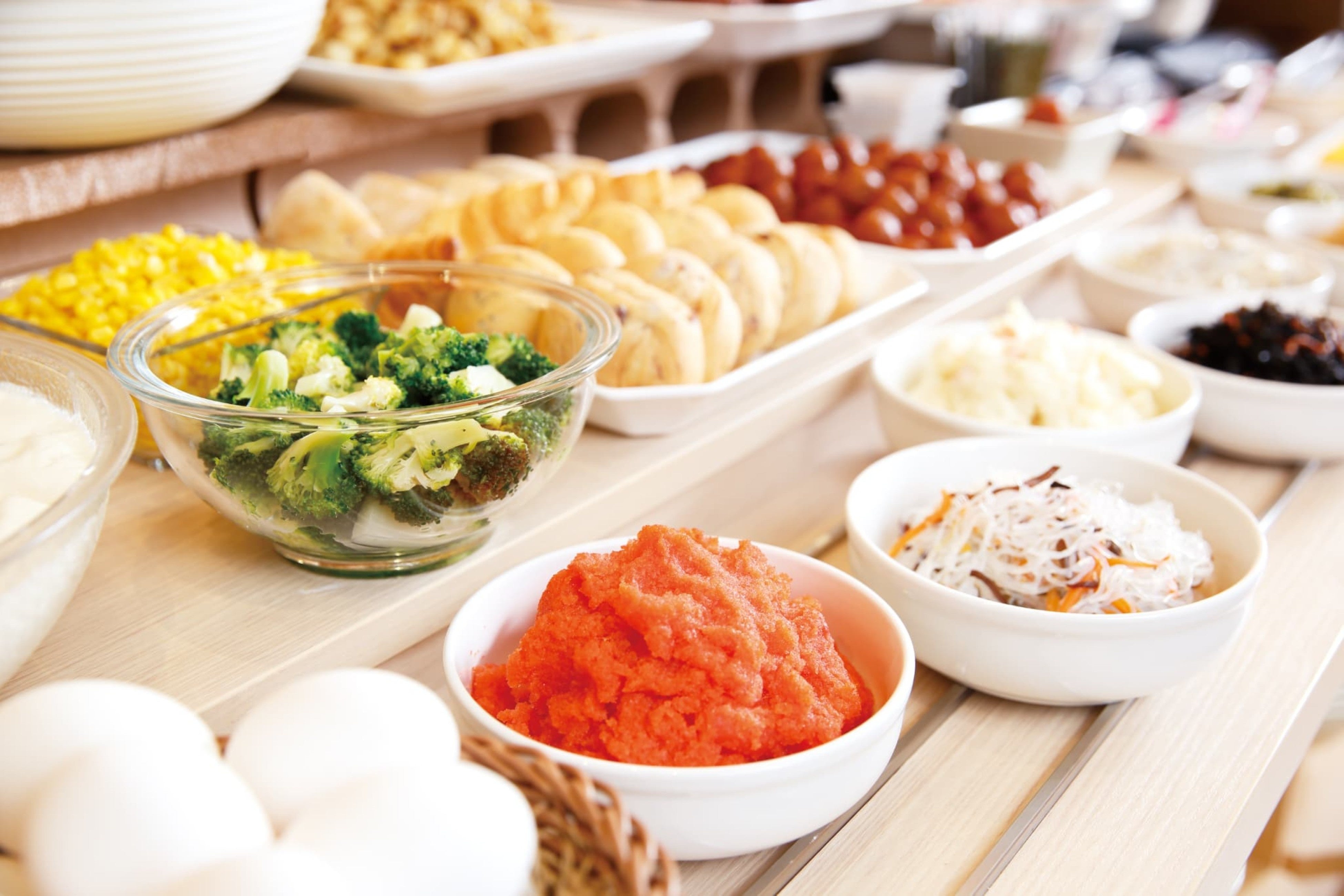 館内にはレストランを併設しており、宿泊者は無料の朝食バイキングを利用できます。朝の時間を有効に使える点は、ビジネス利用・観光利用の双方で支持されています。夕食についてもバイキングを提供しており、館内で満足いくまで楽しめます。また、アルコール飲み放題のサービスも用意しており、外出せずにゆっくりとした夜の時間を過ごすことができます。