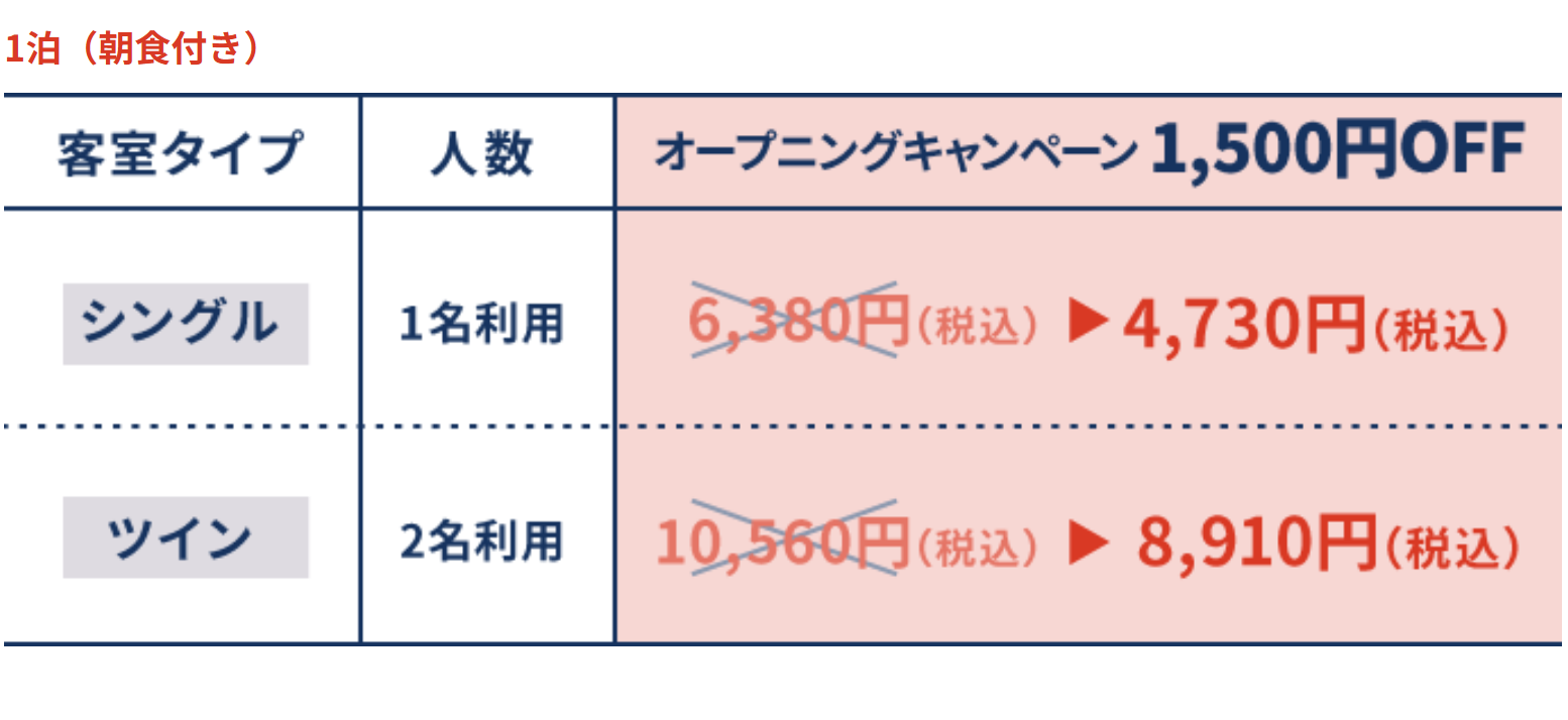 開業から1ヶ月の期間限定で、通常料金より1室1500円割引の特別価格にてご宿泊いただけます。 シングルルームなら1泊4,000円台という驚きのプライスで、HOTEL AZの快適なサービスをご利用いただけます。