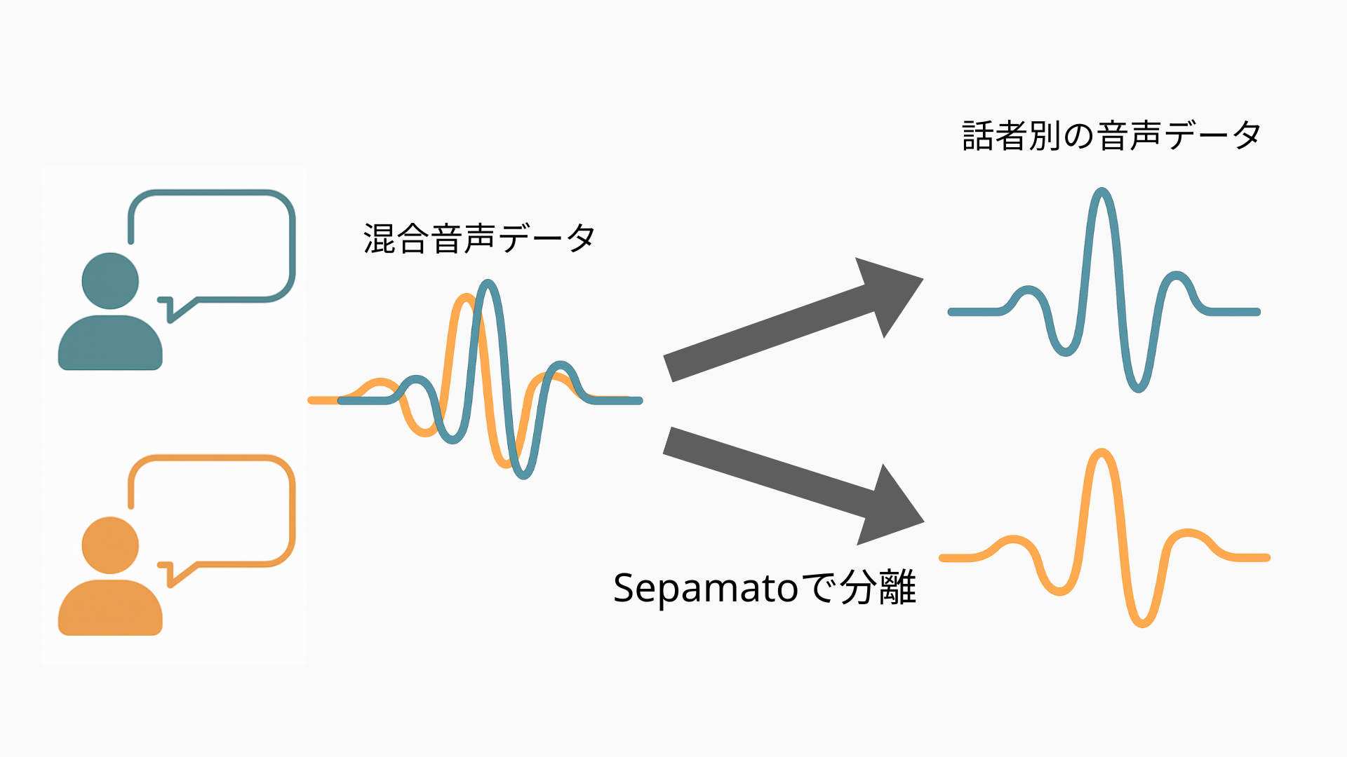Sepamatoは、モノラル音源から各話者を高精度に分離する、日本語最適化の話者分離モデルです。日本語音声データセット(JVS)を用いた評価では、SI-SNRiが公開モデル比で2倍以上となりました。特定話者や特定領域の語彙に対する最適化により、さらなる精度向上が可能です。