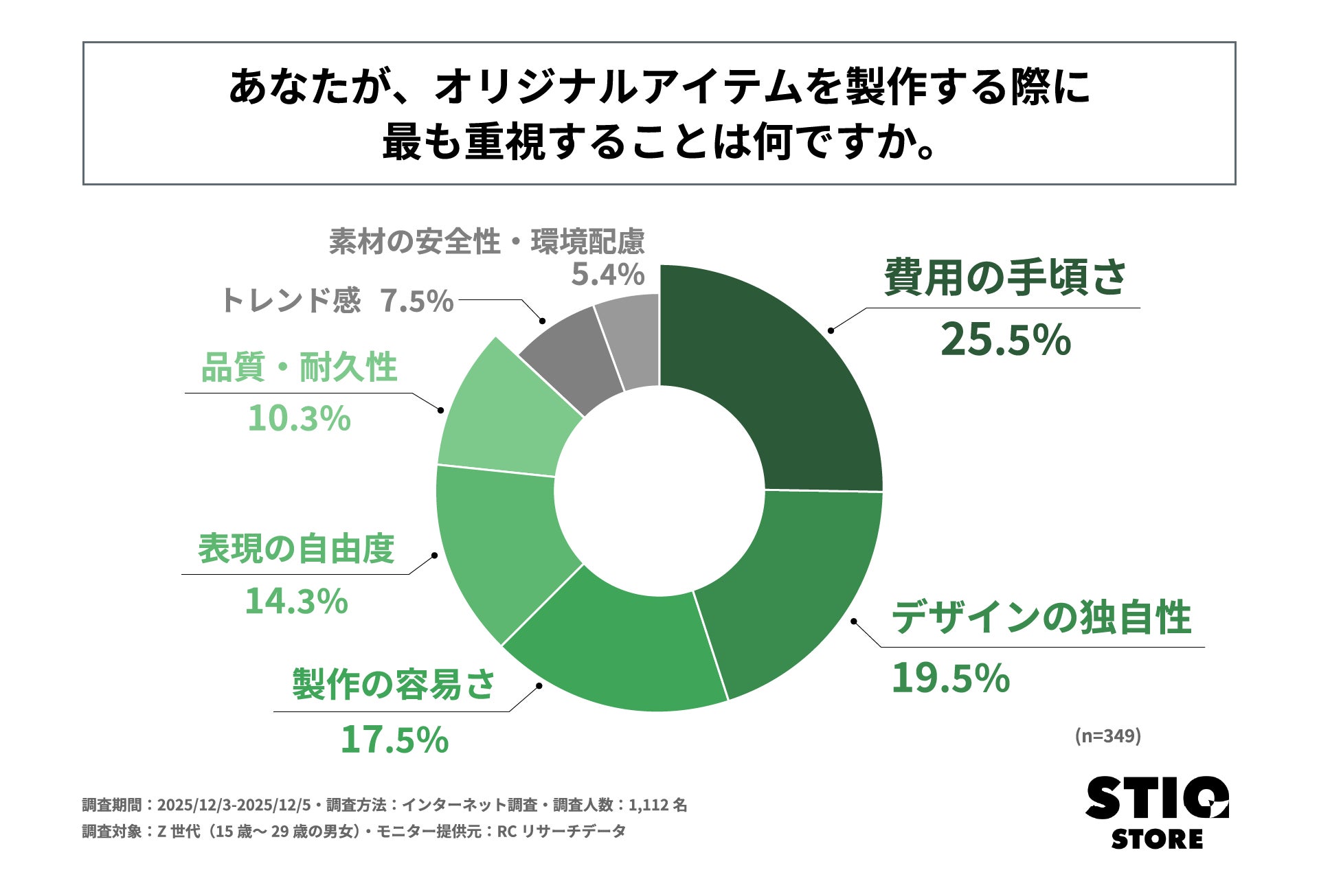 続いて、オリジナルアイテムを製作したことのあるZ世代を対象に「オリジナルアイテムを製作する際に最も重視することは何か」を尋ねる設問への回答では、1位が「費用の手頃さ」で25.5%、2位が「デザインの独自性」で19.5%、3位が「製作の容易さ」で17.5%という結果になりました。この結果から、オリジナルアイテムを製作する際に最も重視することは「費用の手頃さ」であることが判明しました。