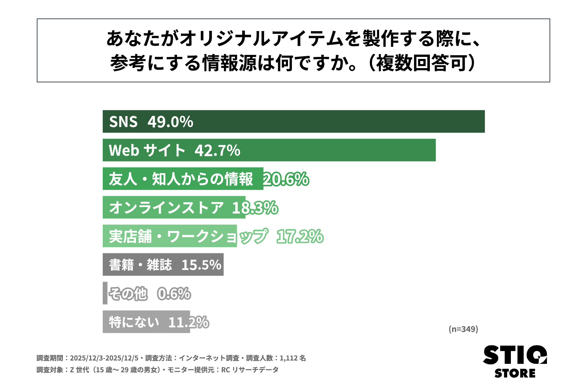 また、オリジナルアイテムを製作したことのあるZ世代を対象に、「あなたがオリジナルアイテムを製作する際に、参考にする情報源は何か」を尋ねる設問への回答では、1位が「SNS」で49.0%、2位が「Webサイト」で42.7%、3位が「友人・知人からの情報」で20.6%という結果になりました。この結果から、オリジナルアイテムを製作したことのあるZ世代の約半数が、製作する際の情報源として「SNS」を活用していることが明らかになりました。