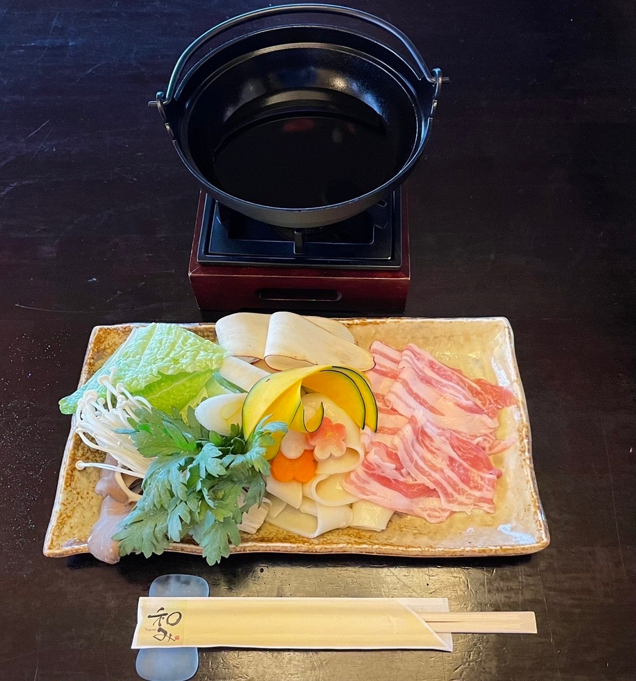 昼には、山梨の郷土料理“ほうとう”を贅沢に進化させた「富士山幻の豚ほうとう御膳」をご用意。幻の豚の柔らかい旨味が、「和み」特製の出汁に溶け込み、野菜とともに心も身体も温めます。地元の旬菜をふんだんに使った御膳は、旅の途中にもぴったりな滋味深い一膳。富士山の湧水とともに味わうその一杯は、まさに山梨の恵みそのものです。