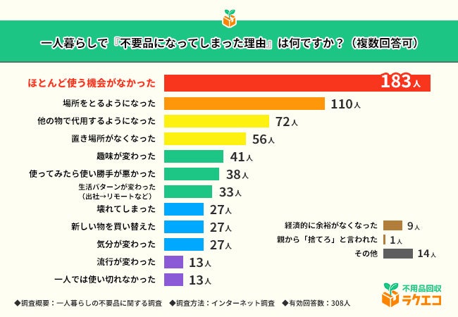 不用品回収ラクエコ(所在地:静岡県浜松市東区、事業責任者:氏原 雄一郎)は、一人暮らしで不要なものがある308名を対象に、一人暮らしの不要品に関する調査を実施しました。