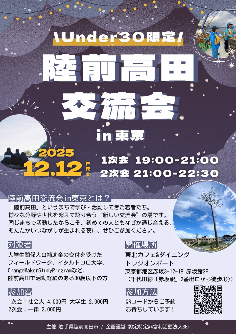岩手県陸前高田市は、認定特定非営利活動法人SETと連携し、陸前高田に関わった30歳以下の若者を対象とした「陸前高田交流会 in 東京」を、2025年12月12日(金)に開催いたします。