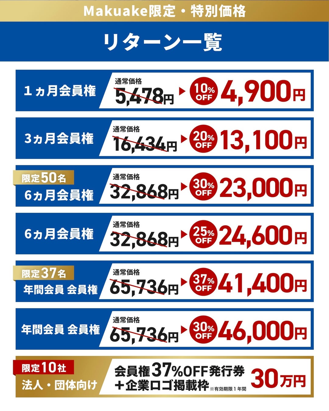 日本最大級のクラウドファンディングプラットフォーム「Makuake」にて、最大37%OFFのお得なリターンをご用意しました。お試し感覚で利用できる1ヶ月プランから、最大割引率の数量限定年間プランまで、Makuake限定の特別価格で購入が可能です。また、個人様向けのプランだけではなく、法人・団体様向けのリターンまで、幅広いラインナップを揃えています。サウナを日常に、お得に取り入れられる特別な41日間をお見逃しなく。
