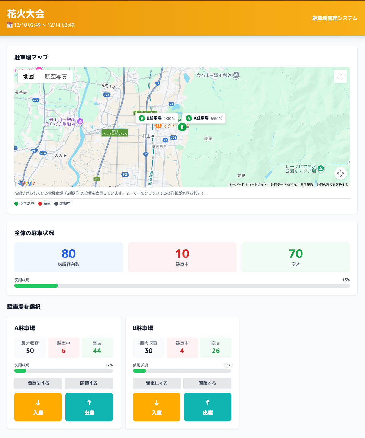 イベント会場周辺に複数の駐車場がある場合でも、すべてを一つの画面で管理できます。各駐車場の収容台数、現在の利用状況をリアルタイムで把握。「A駐車場は満車だけど、B駐車場はまだ余裕がある」といった状況が一目でわかります。