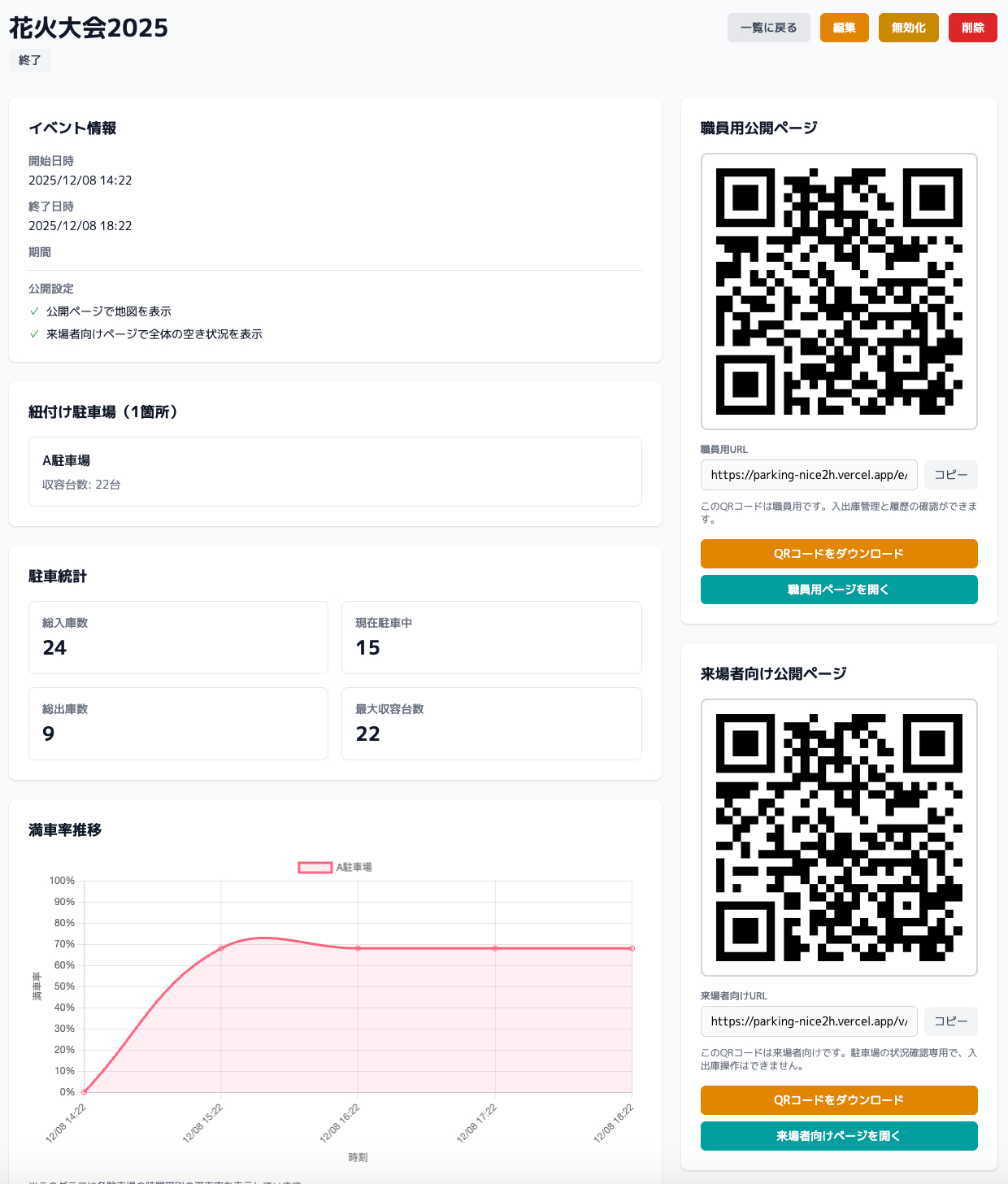 イベントごとにQRコードを発行できます。各駐車場に配置された職員は、スマートフォンでQRコードを読み取るだけで管理ページにアクセス。特別なアプリのインストールは不要です。