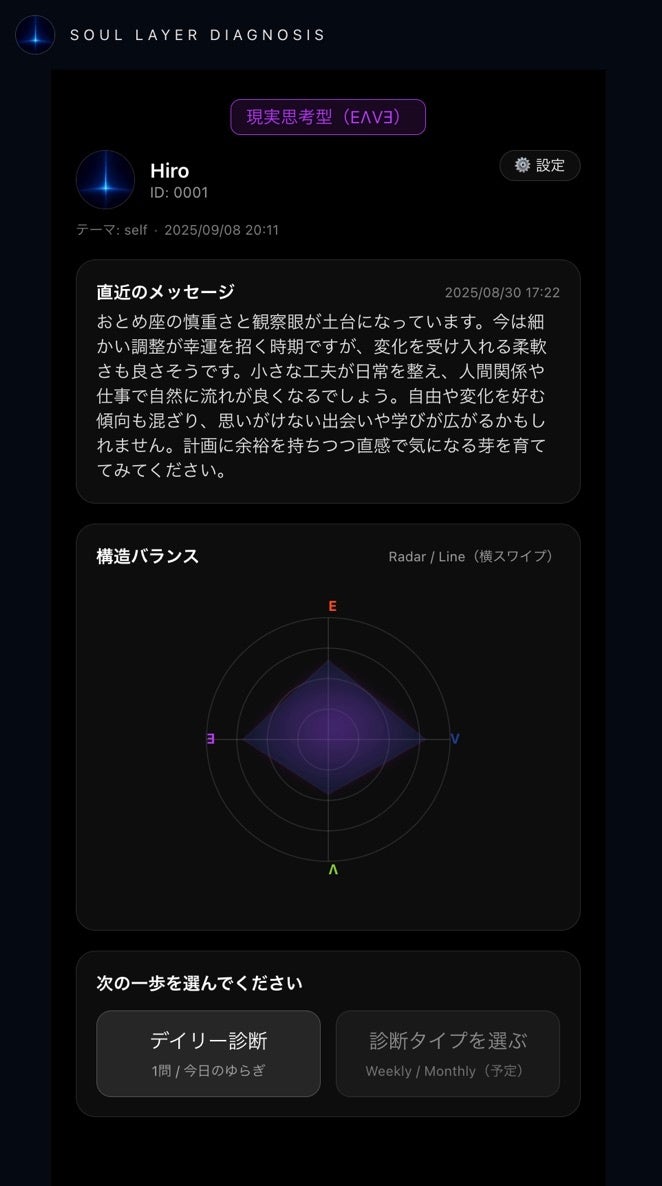 EVΛƎ(イーヴァ)フレームワークを基盤に開発された、AI自己構造診断アプリ「Soul Layer Diagnosis(ソウルレイヤー診断)」。