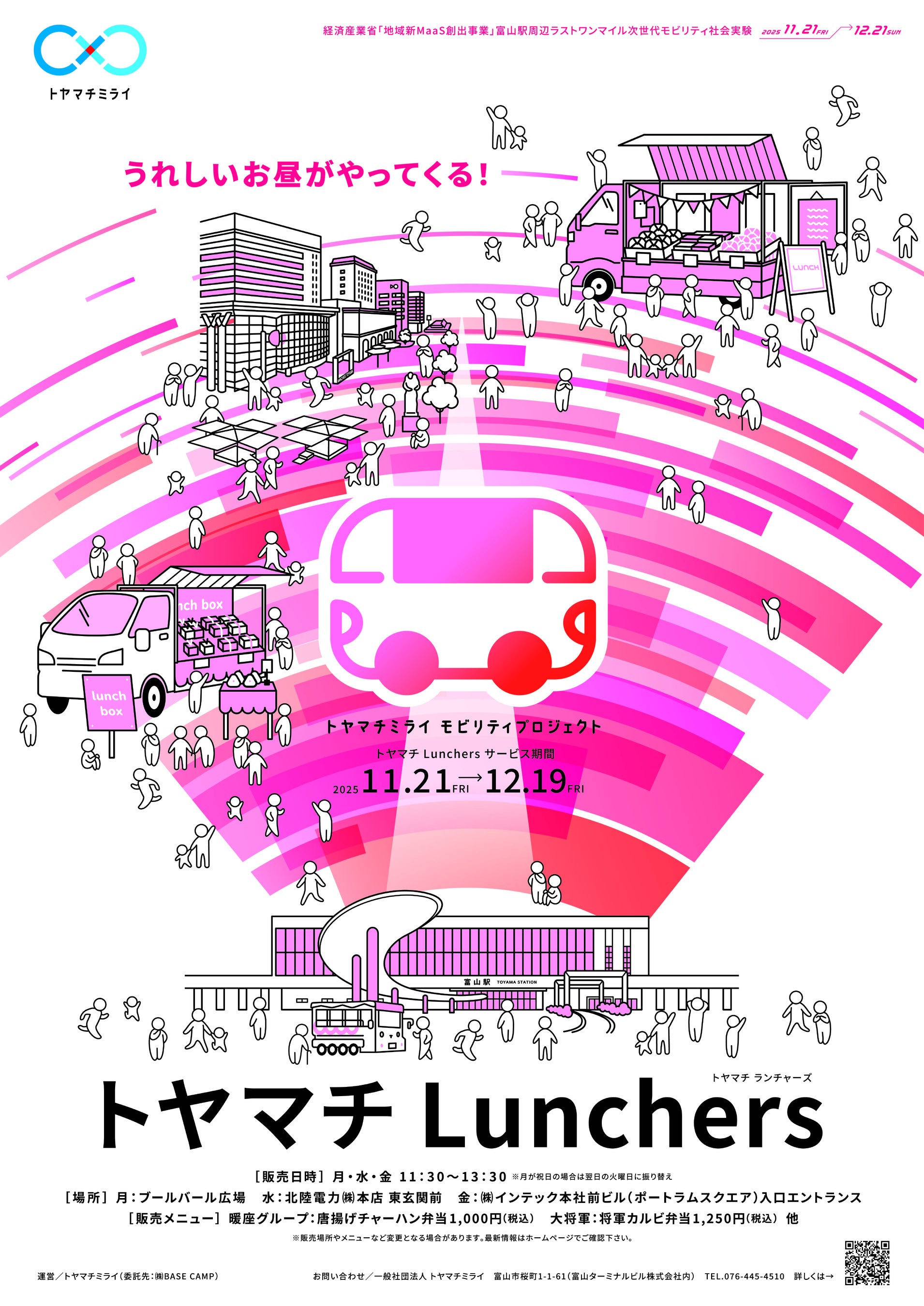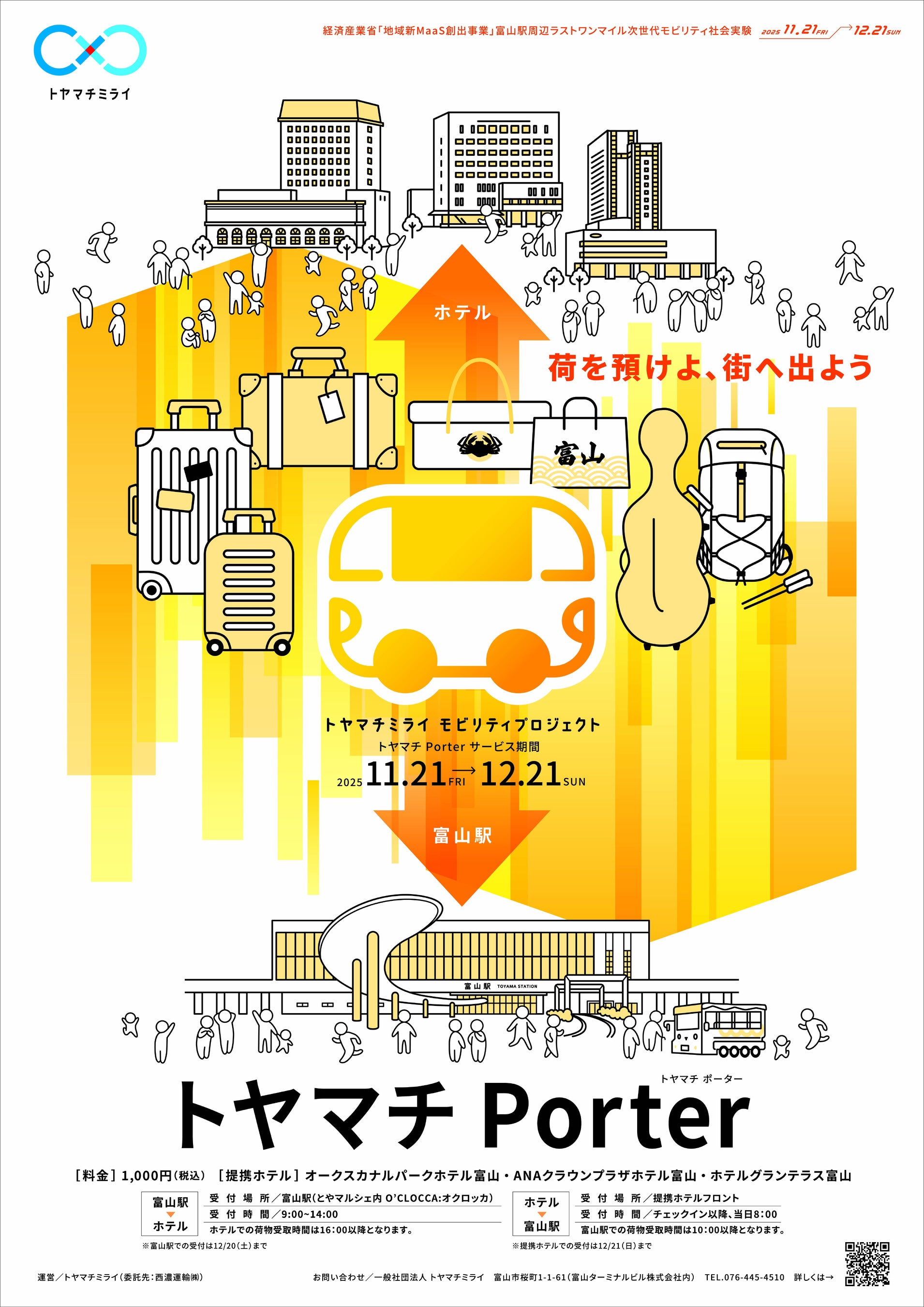一般社団法人トヤマチミライ(富山市桜町一丁目1番61号 代表理事 立石善裕)は、令和6年の発足から、富山駅周辺で活動する企業や団体、自治体とともに作り上げ、また活動の理念として掲げている富山駅周辺エリアの「未来ビジョン」に基づき、各エリア(富山駅南、富山駅、富山駅北)の様々な方たちを「つなぎ・むすぶ」活動を地域の方たちと共に行っています。それらの活動を通じ、富山駅を中心とした地域の課題解消及び次世代を担うモビリティ活用方の検証を目的とした事業である経済産業省「地域新MaaS創出推進事業」富山駅周辺ラストワンマイル次世代モビリティ社会実験を2025年11月21日(金)より始動することをお知らせします。