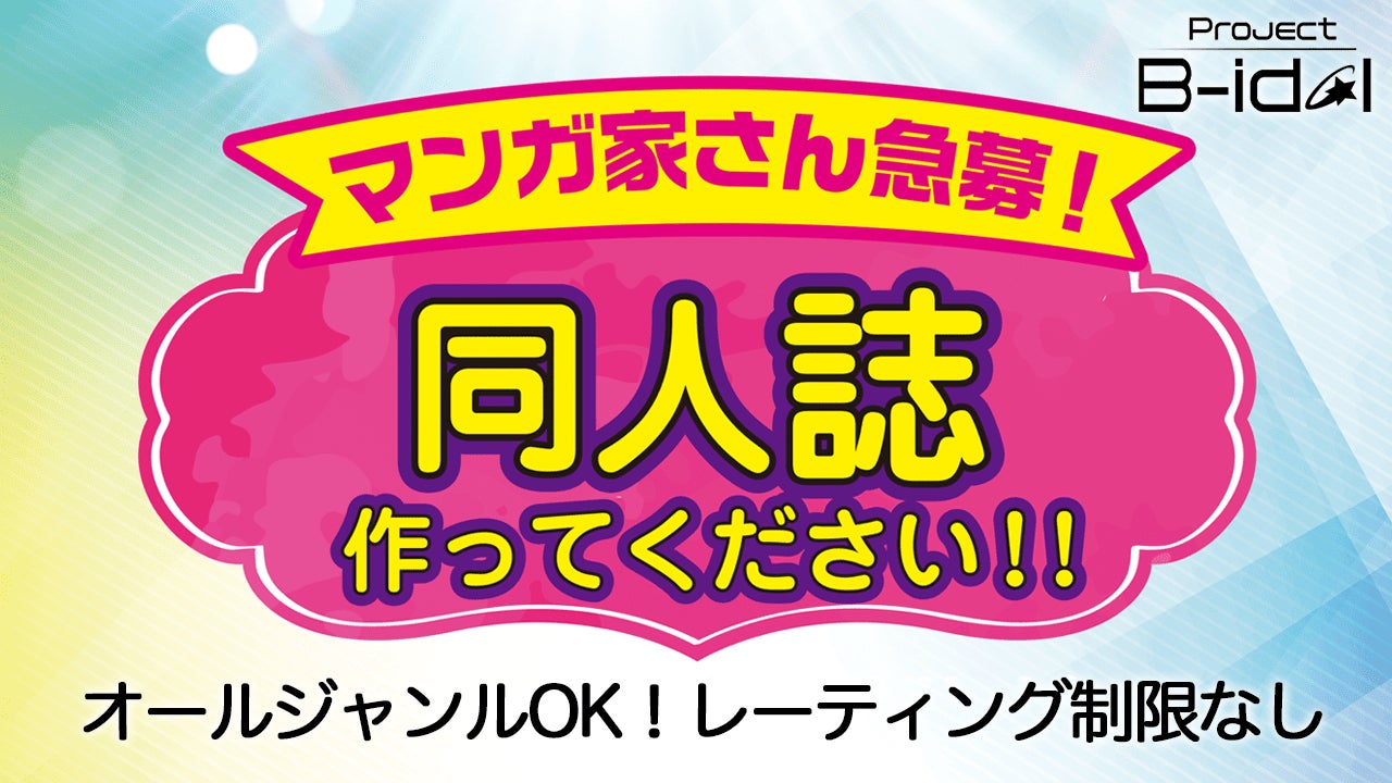 「Project B-idol」は、クリエイターの“創りたい!”という気持ちを全力で応援しています。今回の出展では、二次創作を対象とした同人誌制作応援企画を実施。ジャンル・レーティングともに制限なしで、クリエイター自身の世界観を存分に表現していただけます。制作頂いたクリエイターには制作協力費として一部助成を行い、公式による紹介のチャンスもございます。