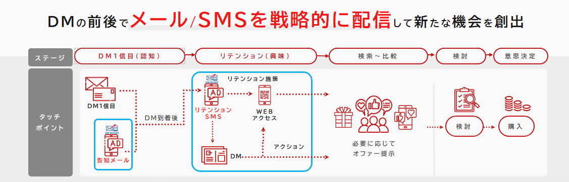「DMブースト」は、DMの到着前後にメール・SMSで通知やフォローを行うことで、DM本来の効果を最大化するサービスです。