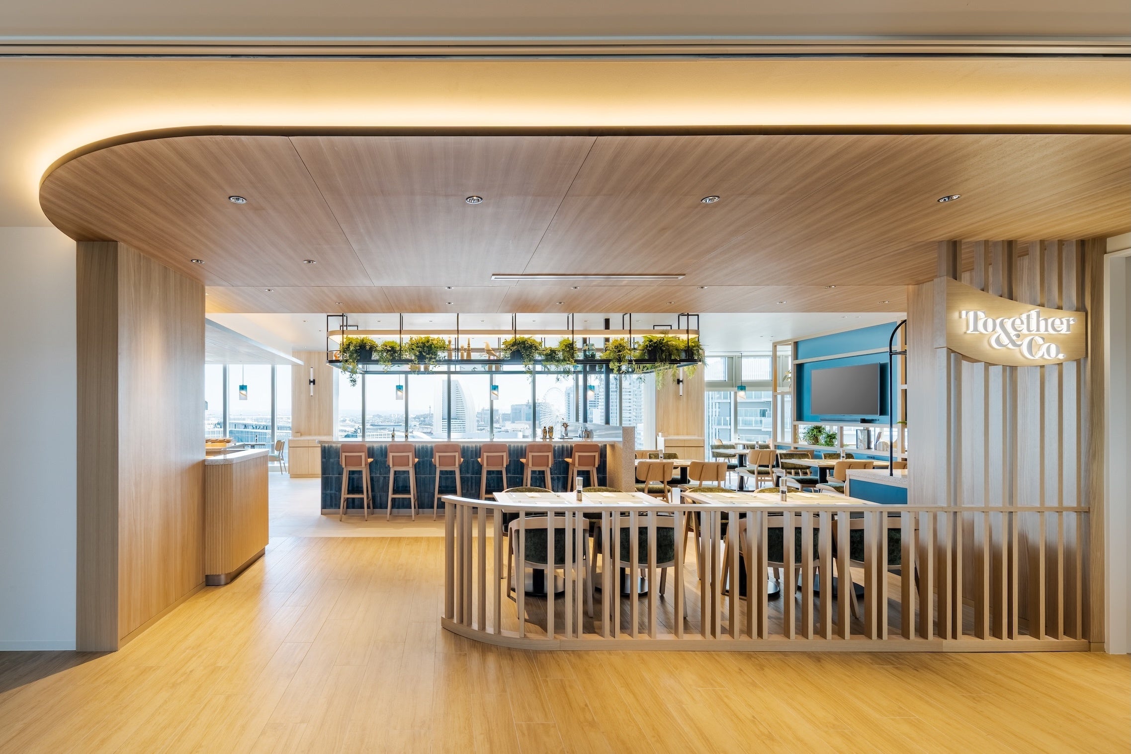 「Together & Co.」は、全112席を備えるゆったりとした空間が広がるオールデイダイニングです。横浜港やベイブリッジを望む開放感あふれるオーシャンビュー、ライブ感たっぷりのオープンキッチン、洗練されながらもくつろげるインテリアが、心地よい時間を演出します。朝食ビュッフェから、メインが選べるランチビュッフェ、アラカルト、ディナーコース、バータイムまで、一日を通して幅広いシーンでご利用いただけます。