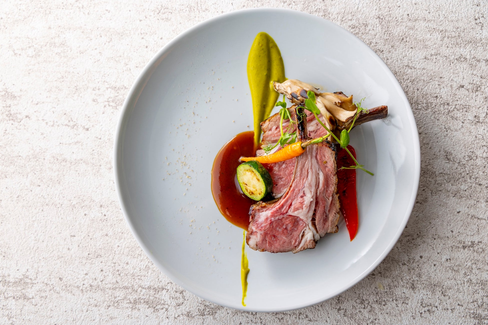 香り高いローズマリーで仕上げたジュ(肉汁をベースにしたソース)と、グリーンマスタードの鮮やかなアクセントが、ラム本来の旨みを引き立てます。丁寧に焼き上げたオーストラリア産ラムチョップは、骨付きカットならではのジューシーさと力強い味わいが魅力。ひと口ごとに広がる豊かな香りとともに、ダイニングに華やかさを添える一皿です。