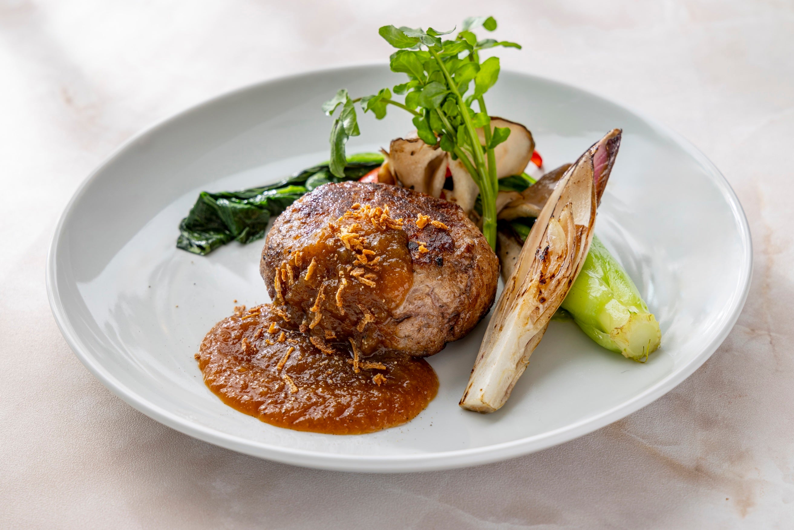 独自配合の粗びきパティを使用。口に入れた瞬間、ふわりと立ちのぼる藁の香りが口の中に広がり、食欲を一層掻き立てます。藁で瞬間的に燻すことで牛肉の脂の甘みを引き出し、香ばしさをまとわせたシェフこだわりの一品。ビーフストック(牛骨を煮出した深みのあるスープ)をベースに、玉ねぎと生姜を合わせたオニオンジンジャーソースが、甘じょっぱさと奥行きのある旨みを生み出し、黒コショウを効かせた力強い肉感と調和する、満足感のある一皿に仕上げました。
