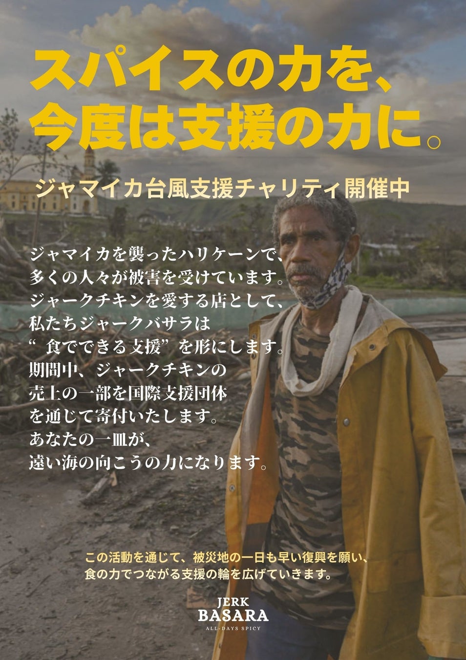 東京・大崎のジャークチキン専門店「大崎ジャークバサラ」は、台風により甚大な被害を受けたジャマイカの人々に向けた支援の一環として、売上寄付によるチャリティを実施いたします。