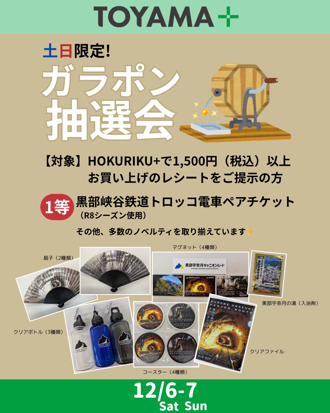 HOKURIKU+で1,500円(税込)以上お買い上げのレシートをご提示の方を対象に、「黒部峡谷鉄道トロッコ電車ペアチケット※」が貰えるガラポン抽選会を実施します!その他、多数のノベルティも取り揃えています。お見逃しなく!