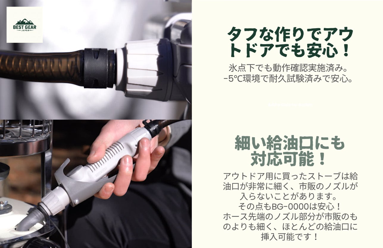 何よりも専用のポンプとタンクが一体型となっており、省スペースで持ち運びも楽になり、単三電池4本で駆動するためいざという時にも活躍いたします。-5℃環境下での耐久・性能試験にも勿論合格しており、品質面にもぬかりありません。直感的に操作が可能ですので、説明書が無くても誰でもご使用いただけます。また、アウトドアシーンで使用されるストーブは注入口が非常に細い傾向があり、一般に販売されているポンプは挿入することができません。その点もこちらのBG-0000は解消してくれます。