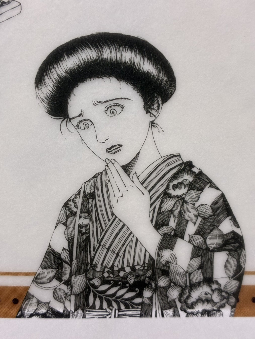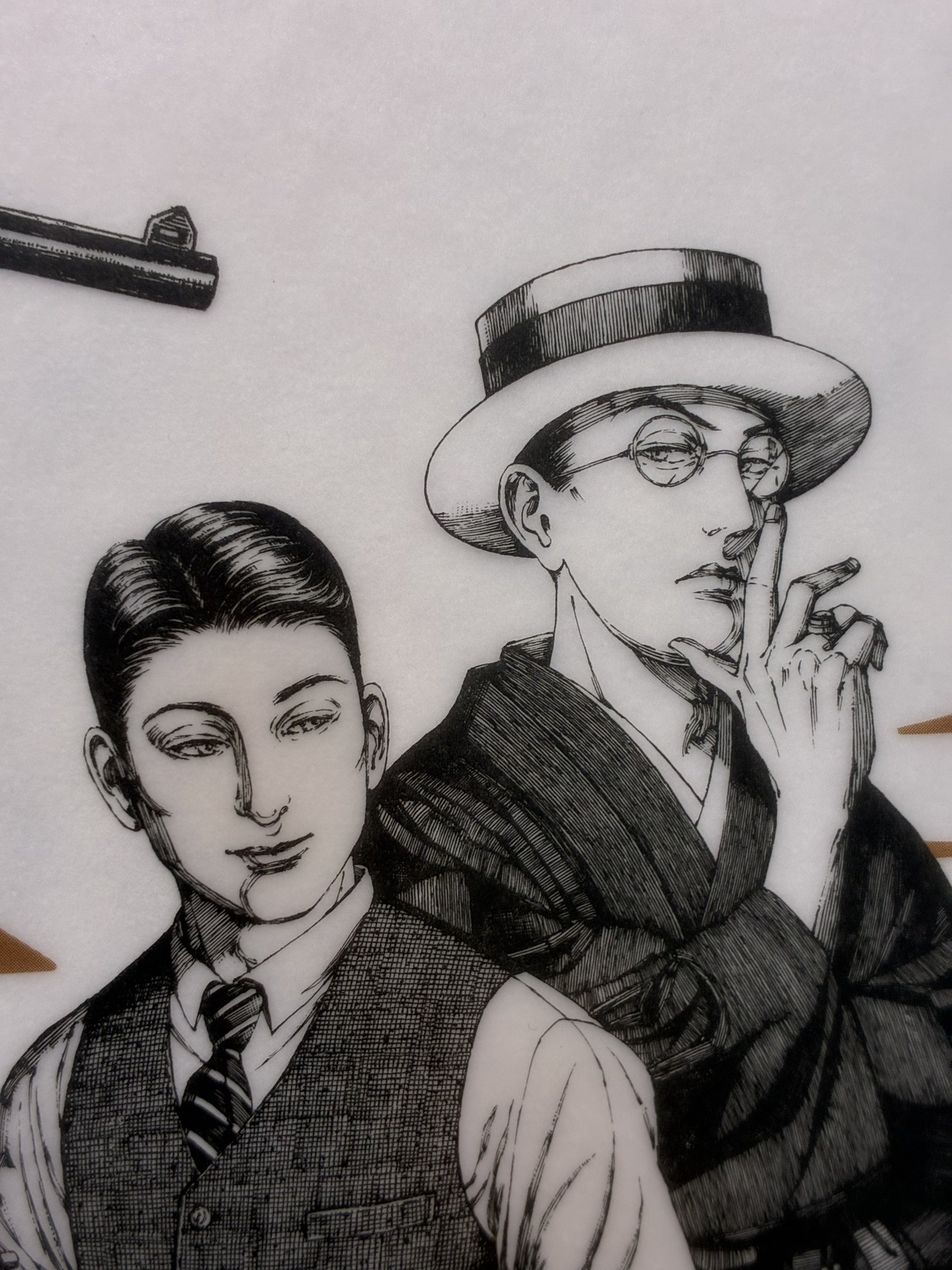 小説の表紙を忠実に再現。銃や本、着物姿の女性などのモチーフが、物語のミステリアスな時代感を呼び起こします。