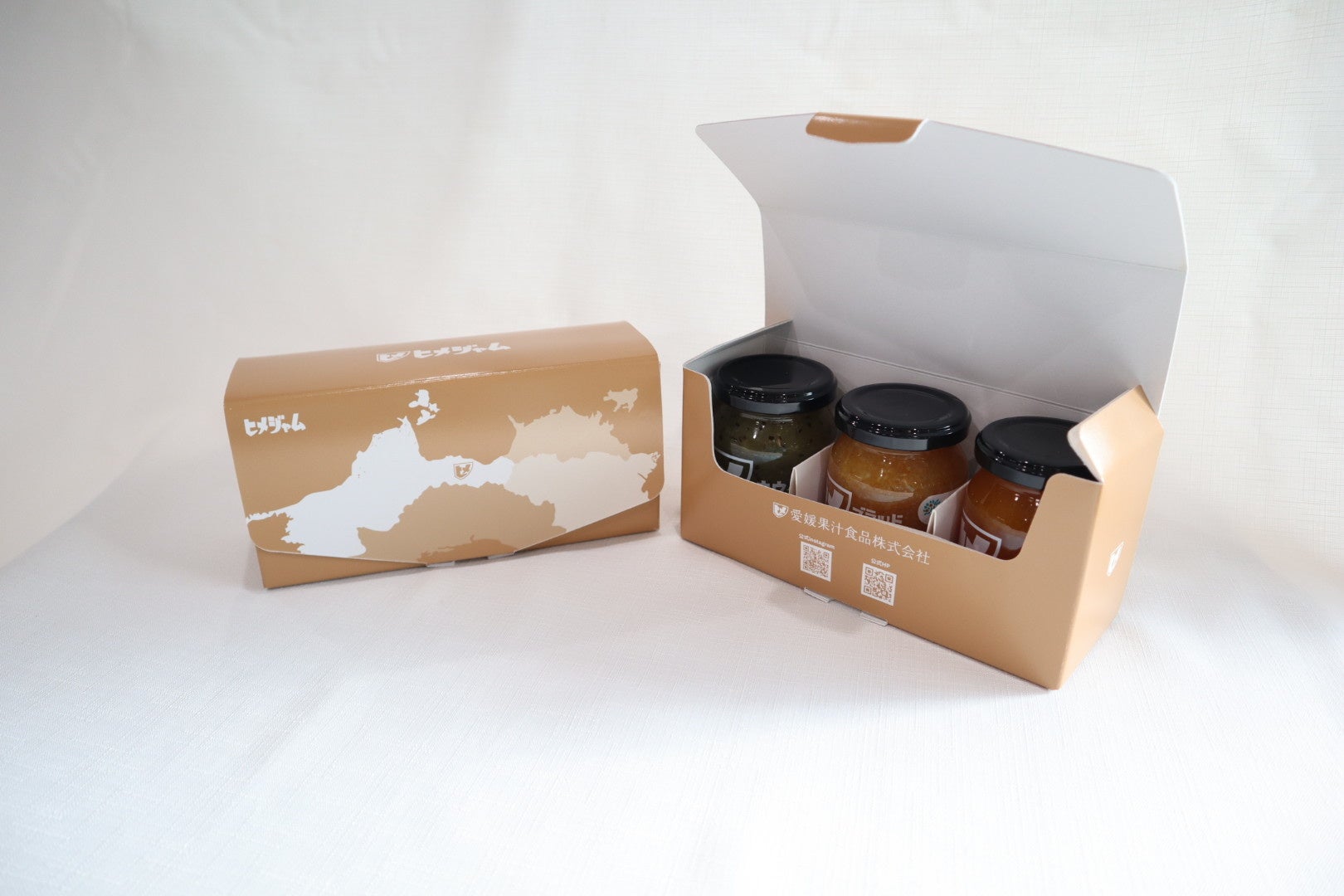 「ヒメジャム」が3本入るオリジナルギフトボックスも登場しました。四国の地図を大きく描き、本社所在地に会社マークを配置することで、一目で“愛媛のお土産”であることが伝わるデザインに仕上げています。素材にはナチュラルなクラフト紙を採用し、温かみのある風合いと環境にやさしい質感を表現。愛媛県産果実を100%使用したジャムとともに、贈る人の想いを包み込む特別なギフトボックスです。観光のお土産や大切な方への贈り物として、愛媛の魅力をそのまま届けます。