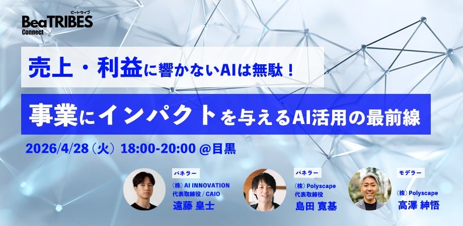 株式会社AI INNOVATIONは、AI活用による事業インパクト創出をテーマとしたイベント「売上・利益に響かないAI導入は無駄!事業にインパクトを与えるAI活用の最前線」を、2026年4月28日(火)に東京都品川区の「BLOCKS MEGURO」にて株式会社Polyscape様と開催いたします。