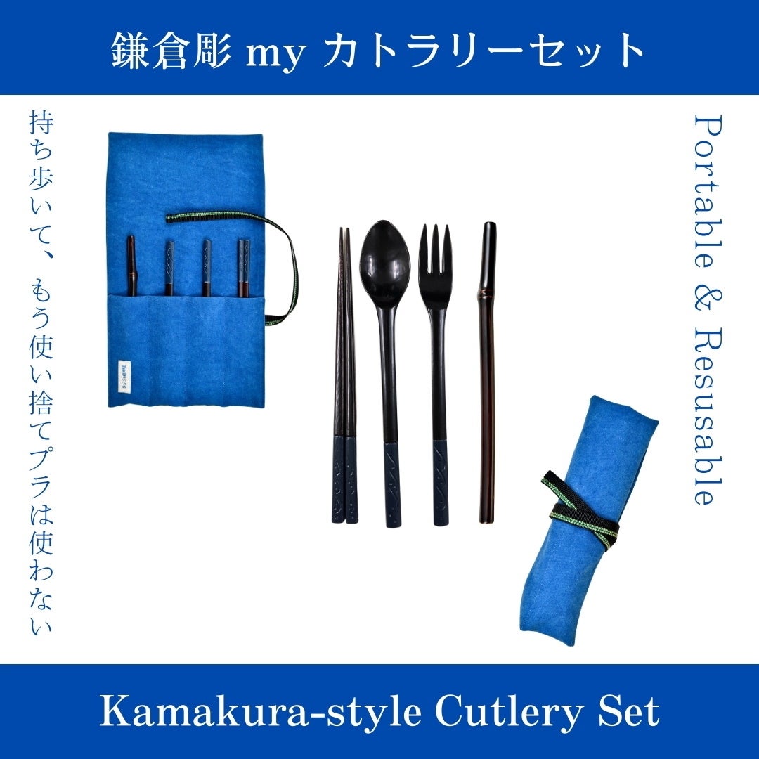 鎌倉彫共同組合様の協力による「鎌倉彫のスプーン、フォーク、箸」と「天然の竹に漆を塗ったストロー」のセットが、帆布を本藍染し京都の老舗の真田紐でまとめるオリジナルキャリーバックに収まります。