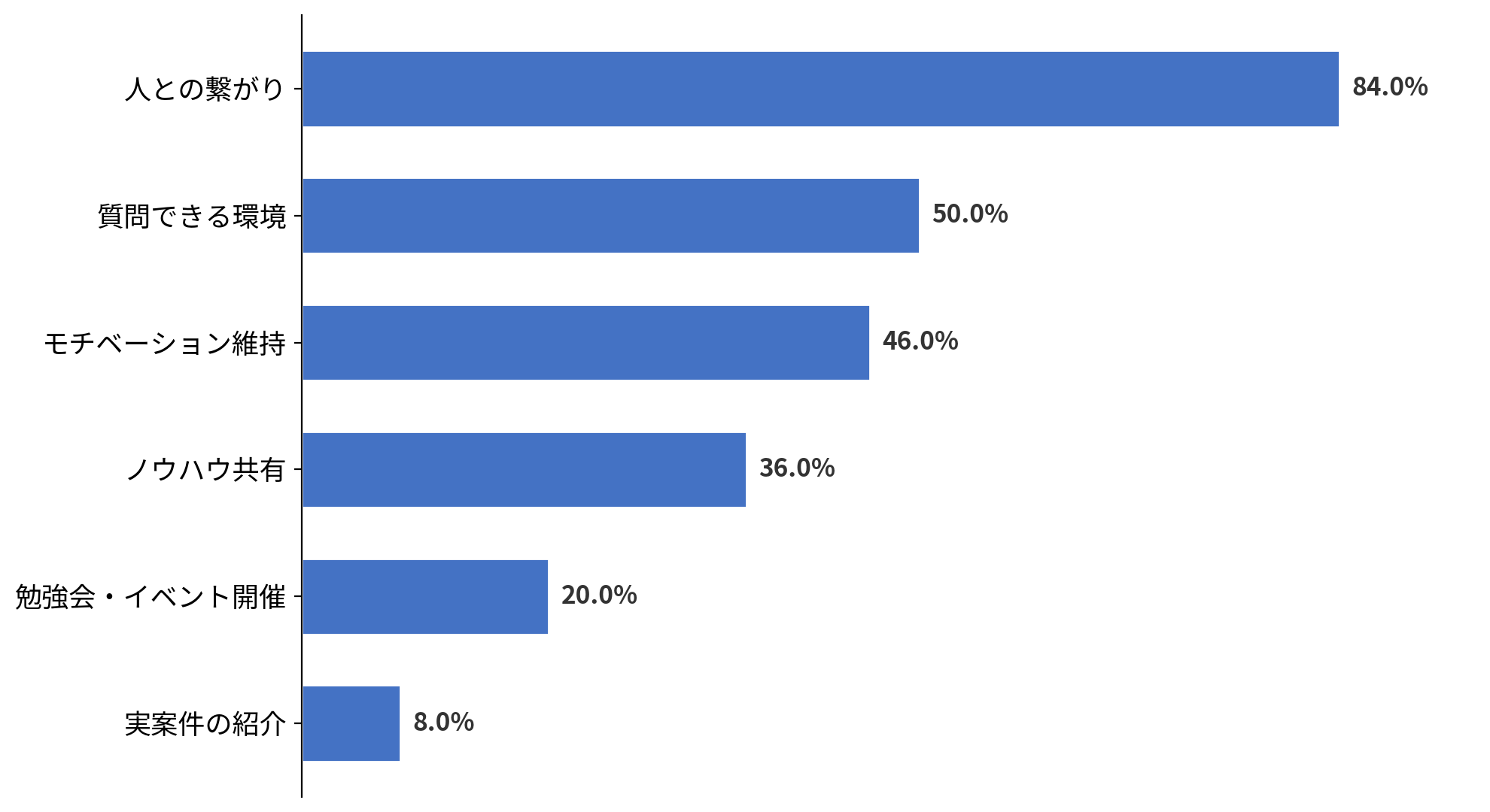 複数選択では「人との繋がり」が8割超と突出しており、コミュニティの本質的価値は人間関係に集約される。質問環境やモチベーション維持も約半数が選択しており、孤独な学習や活動を補完する「伴走」の機能が強く求められていることがわかる。