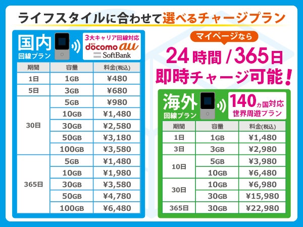 インスタントWi-Fi®の追加データプランは、1GBから100GBまで、利用期間も1日から365日までと、短期利用から長期利用まで幅広くラインナップしております。
