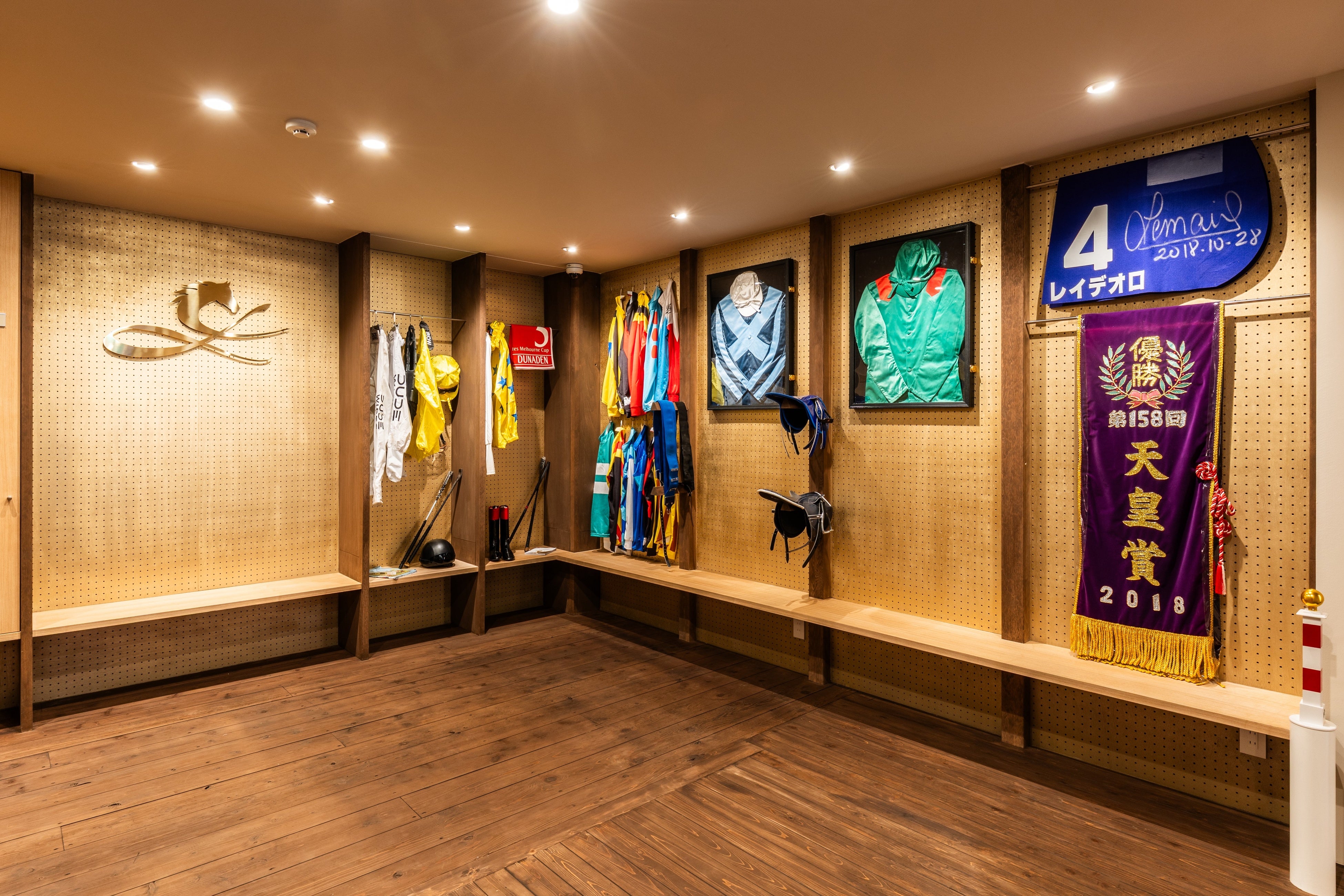 ジョッキールーム — 実際に使用されたジョッキーのヘルメット、ブーツ、勝負服など、競馬の舞台裏を体感できる展示エリア。